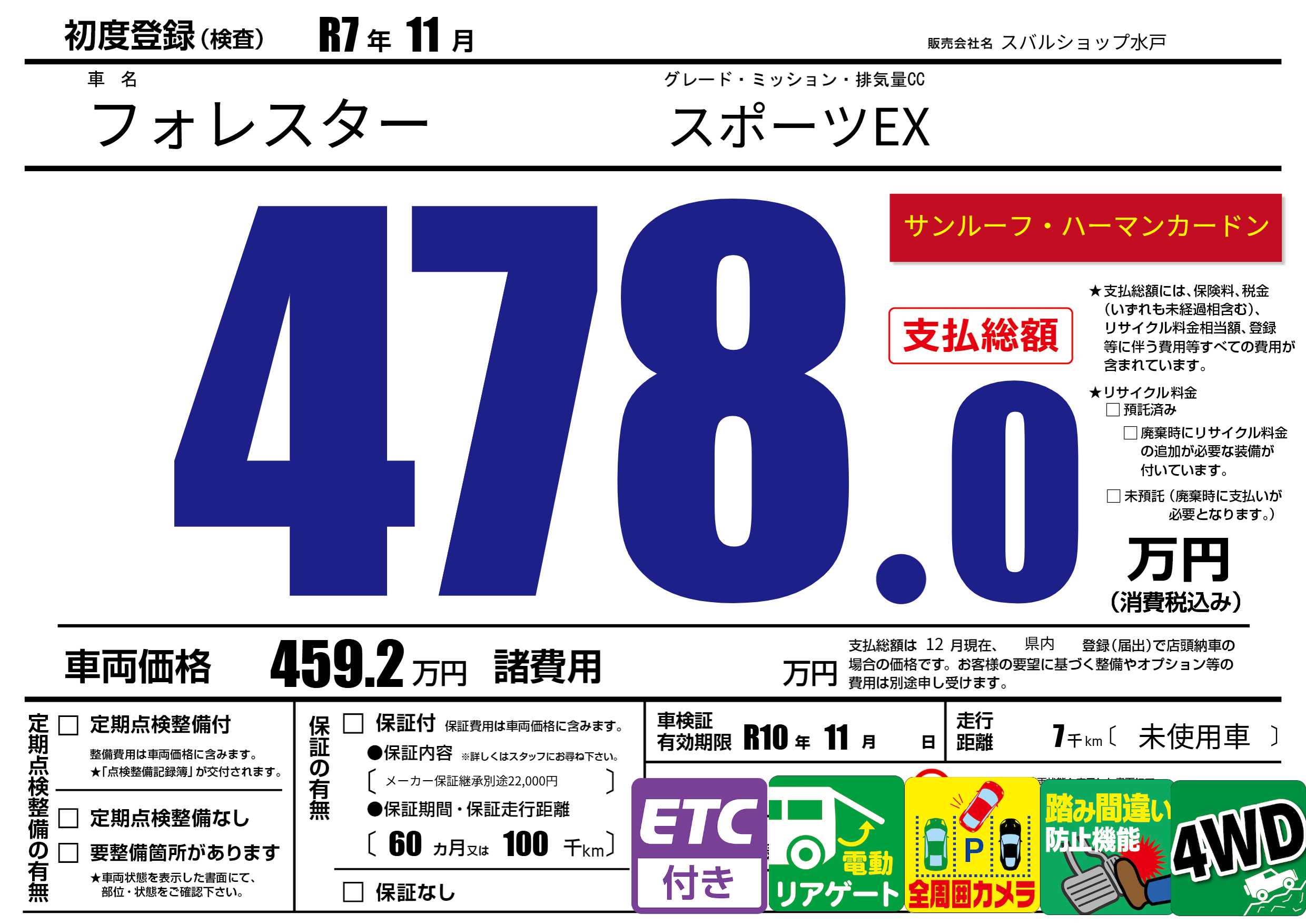 | 走行キロ | 0.7万km | 初年度登録 | R7年11月 |