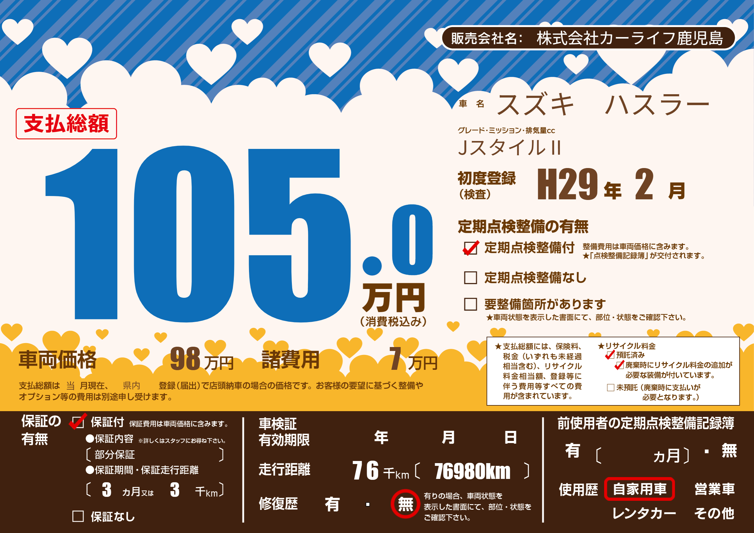| 車名 | スズキ ハスラー | グレード ミッション 排気量 |