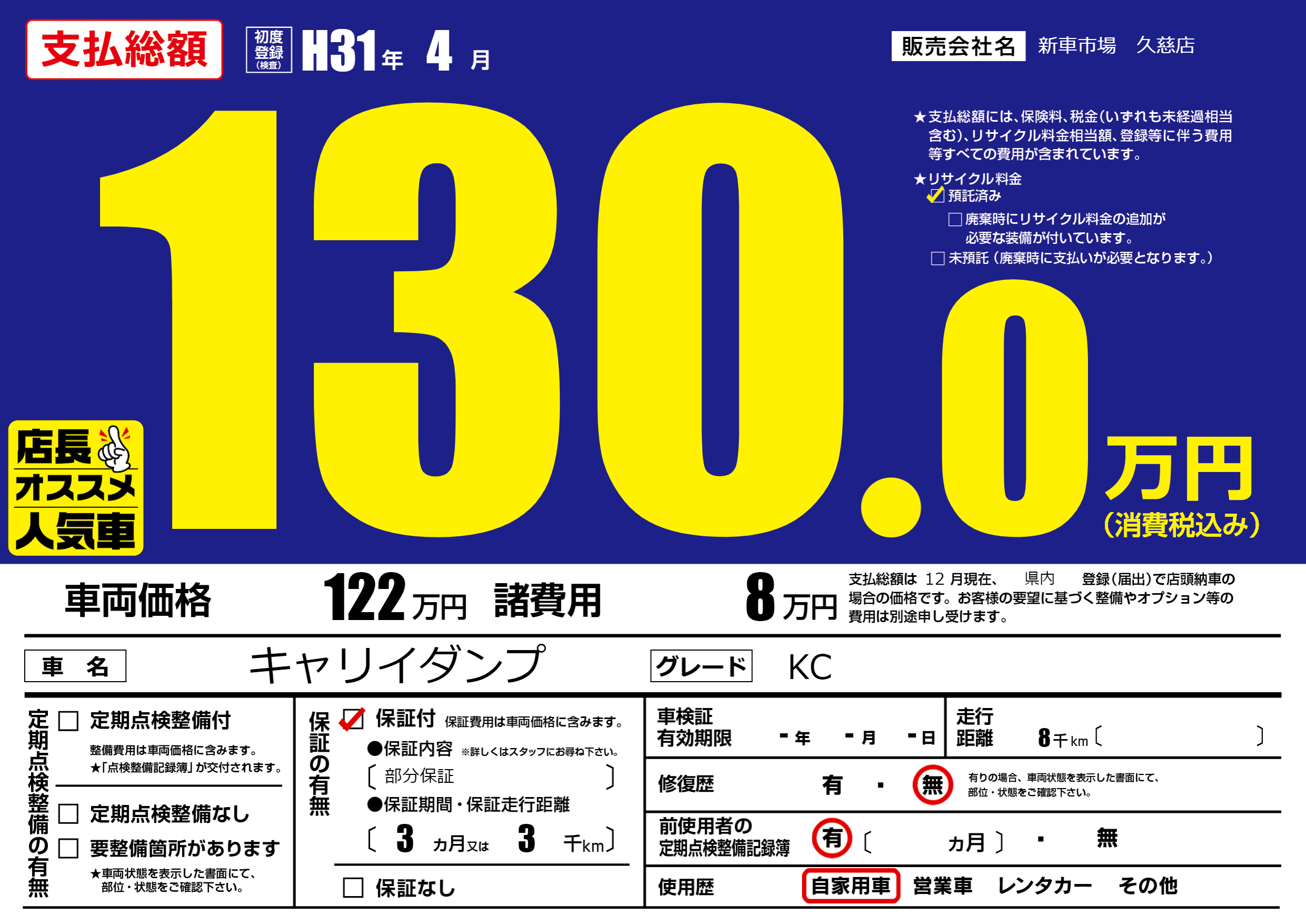 あり | リサイクル預託金相当額 | ( 0円)が別途必要 |
