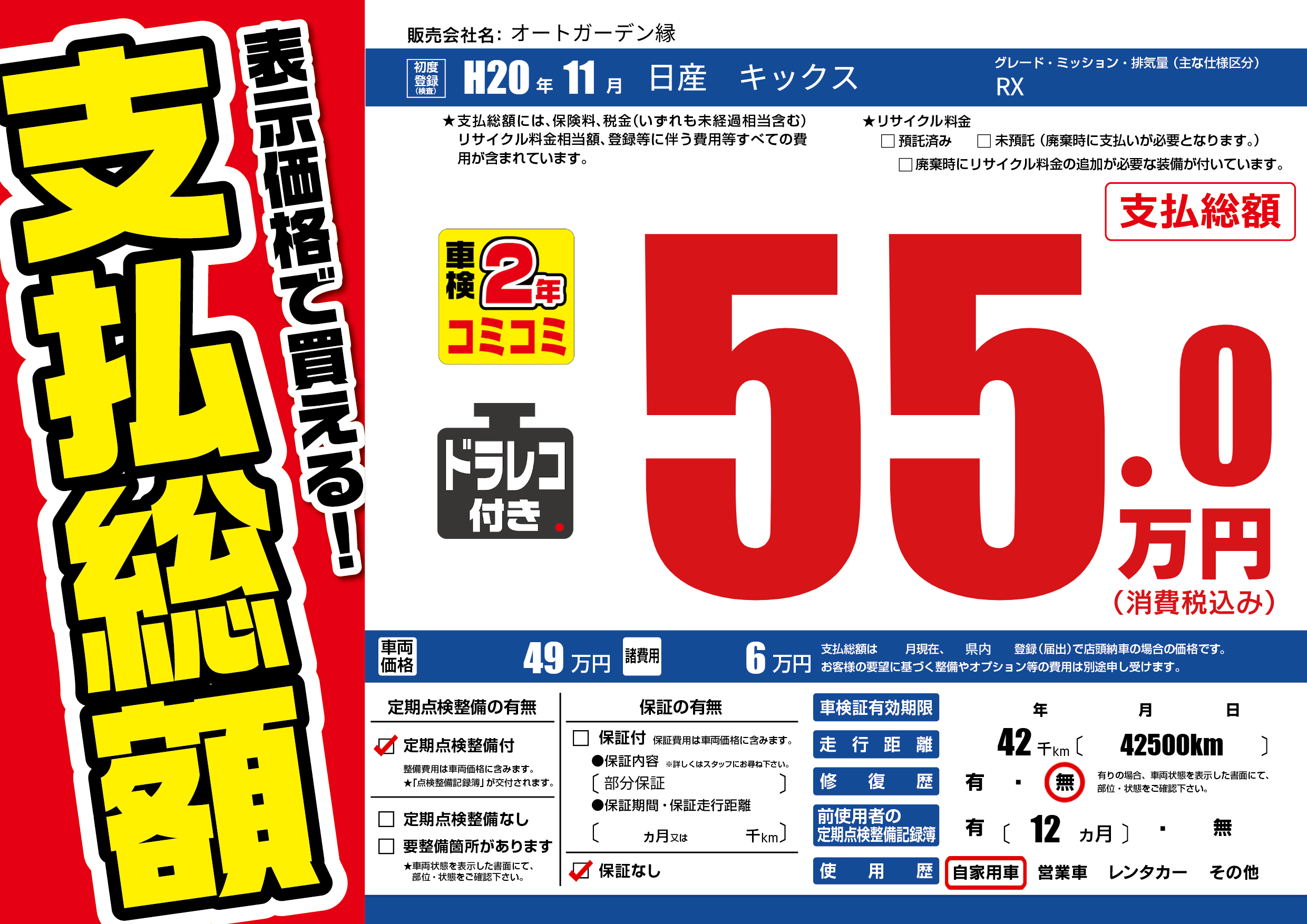 | 走行キロ | 4.2万km | 初年度登録 | H20年11月 |