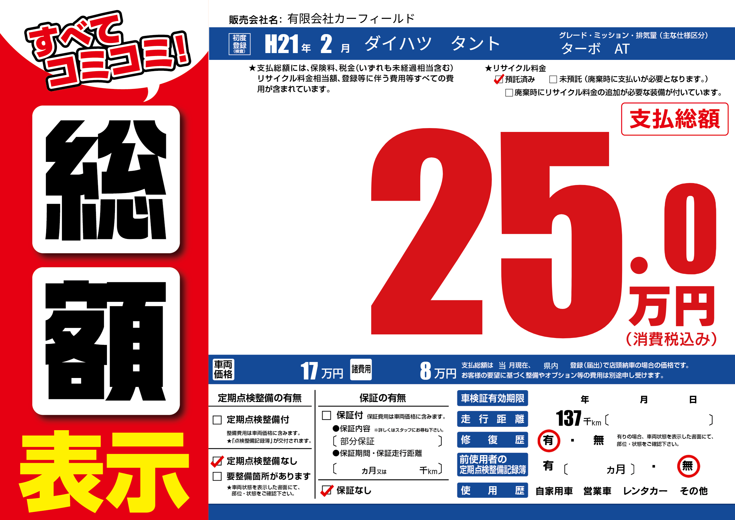 保証なし 保証内容(部分保証) ---ヶ月または()千kmまで |
