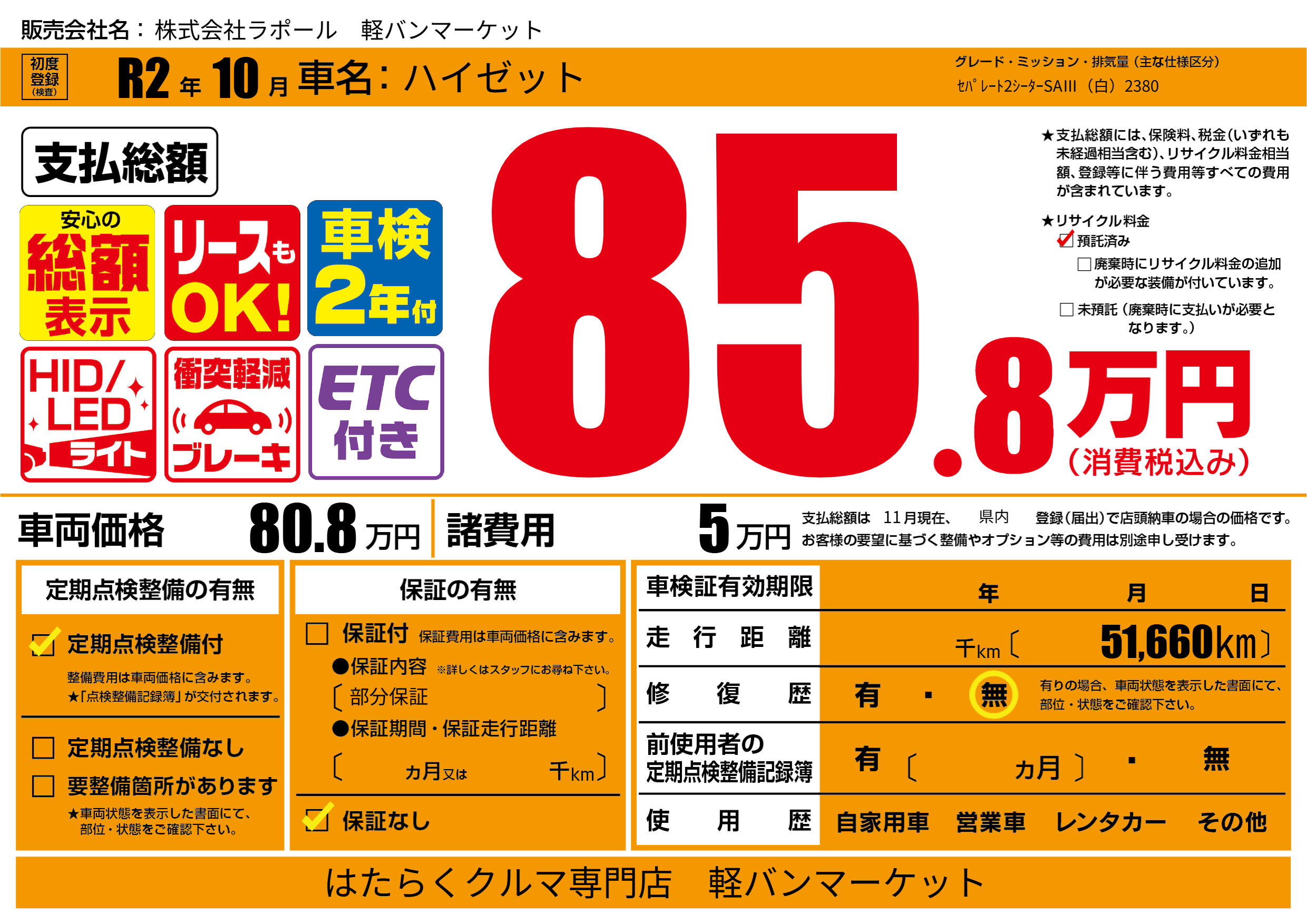 保証なし 保証内容(部分保証) ---ヶ月または()千kmまで |