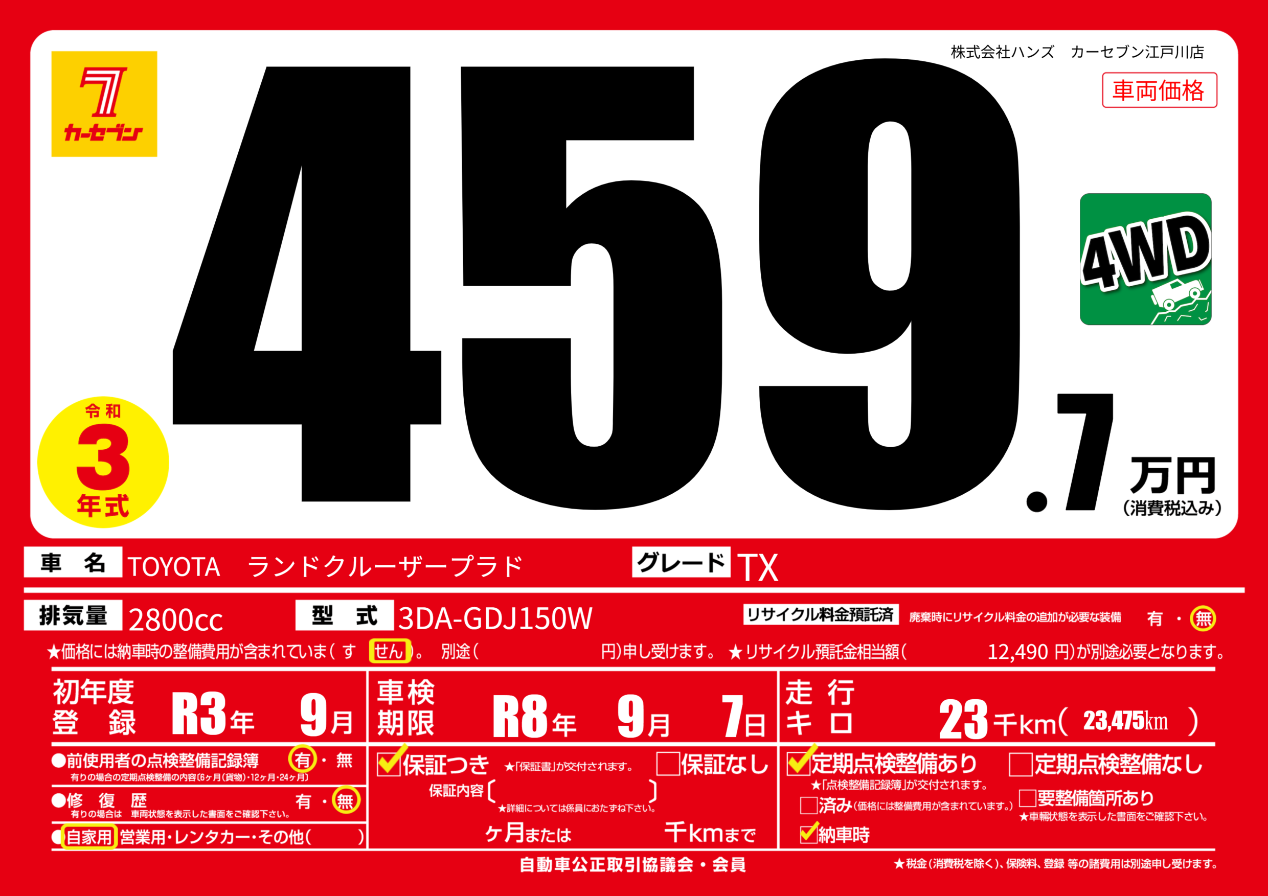 | 車名 | TOYOTA ランドクルーザープラド | グレード ミッション 排気量 |