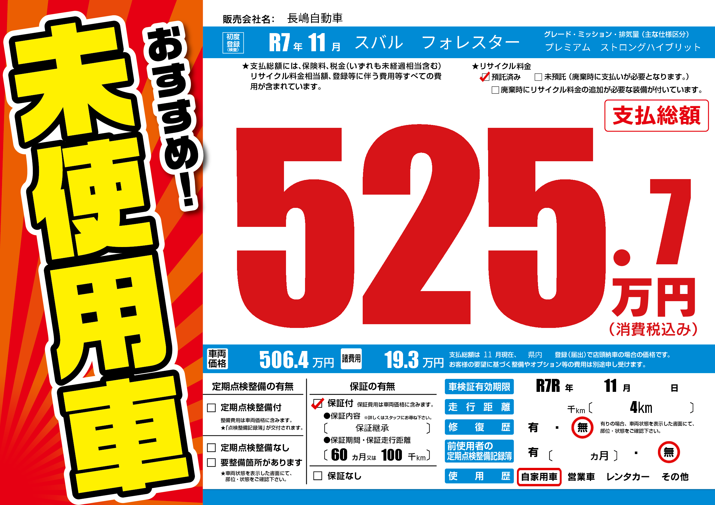 | 走行キロ | - | 初年度登録 | R7年11月 |