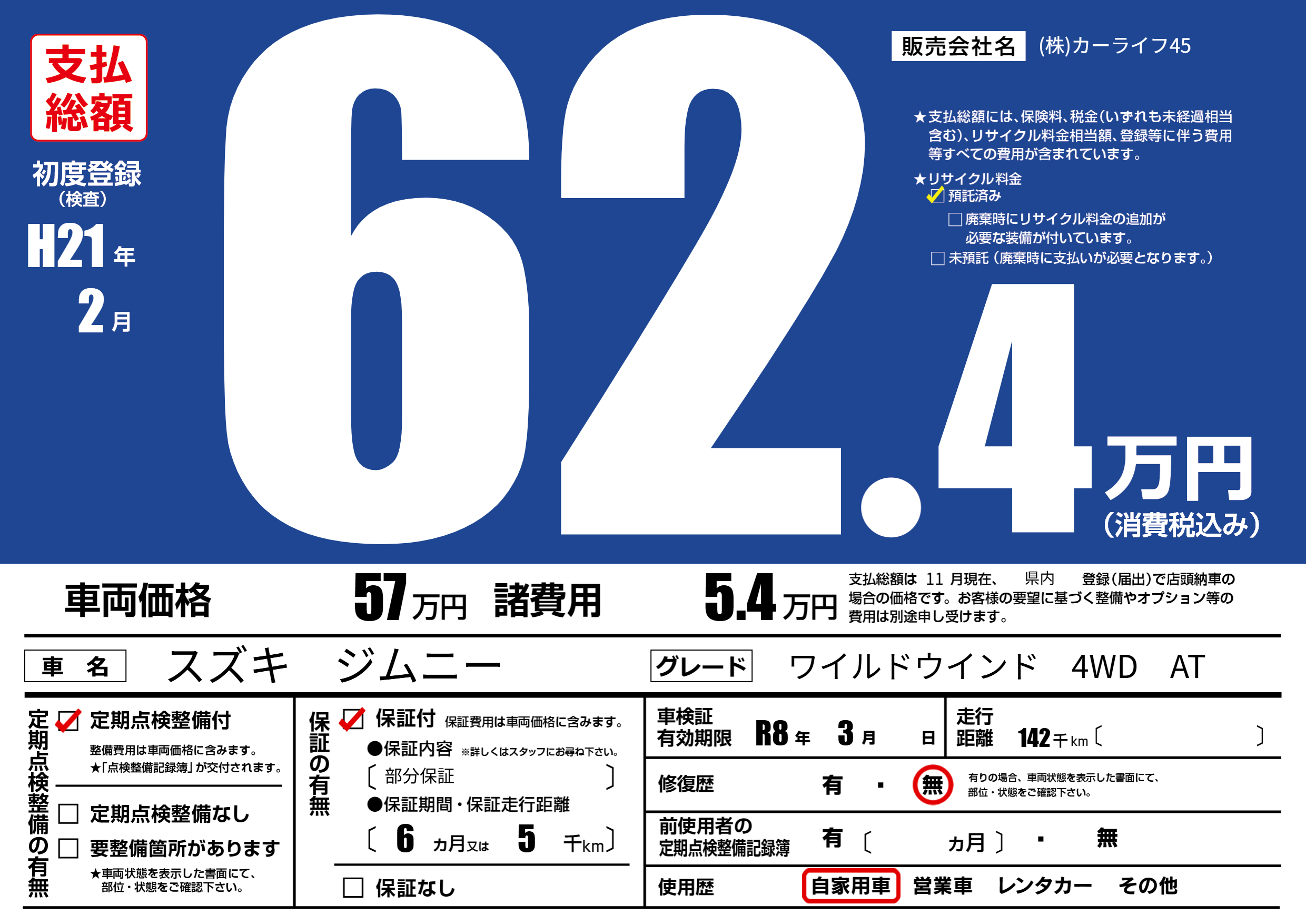 | 走行キロ | 14.2万km | 初年度登録 | H21年2月 |