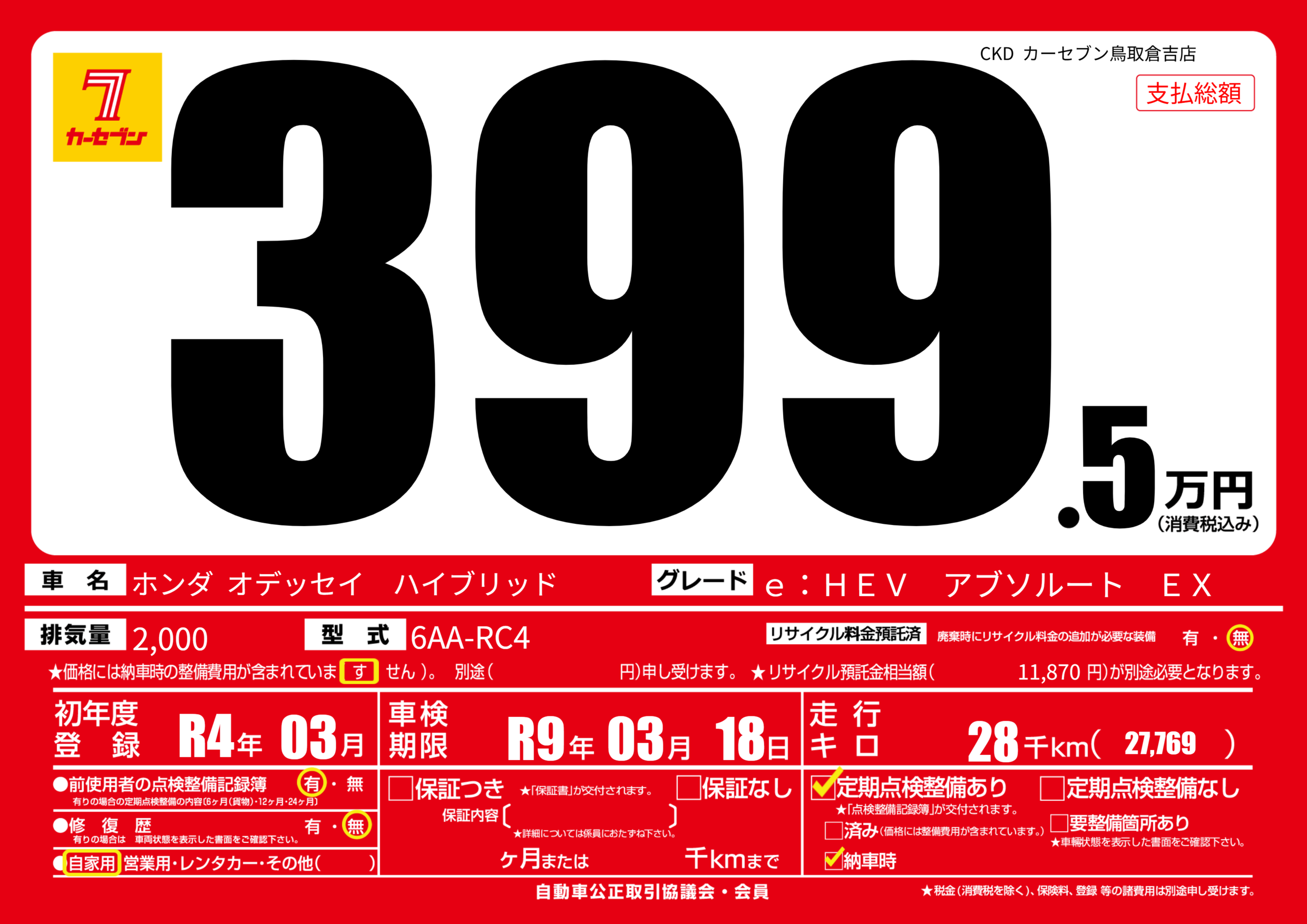 | 定期点検整備 | 定期点検整備あり 納車時あり | ||