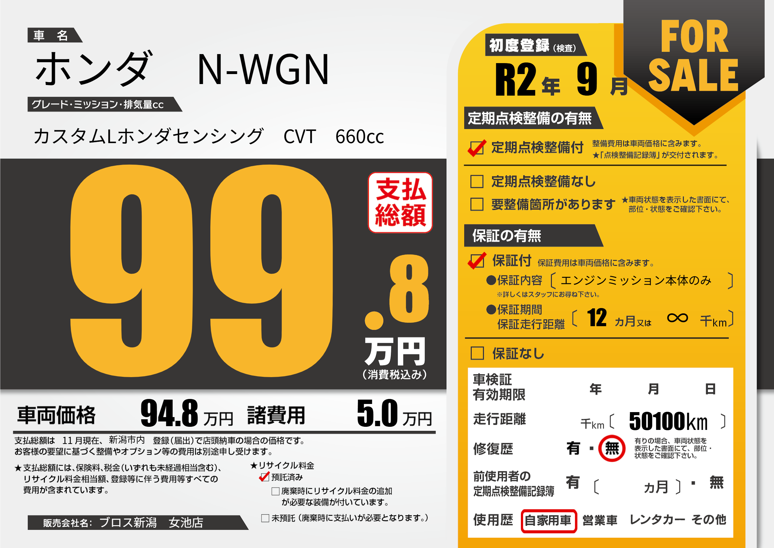 | 車名 | ホンダ N-WGN | グレード ミッション 排気量 |