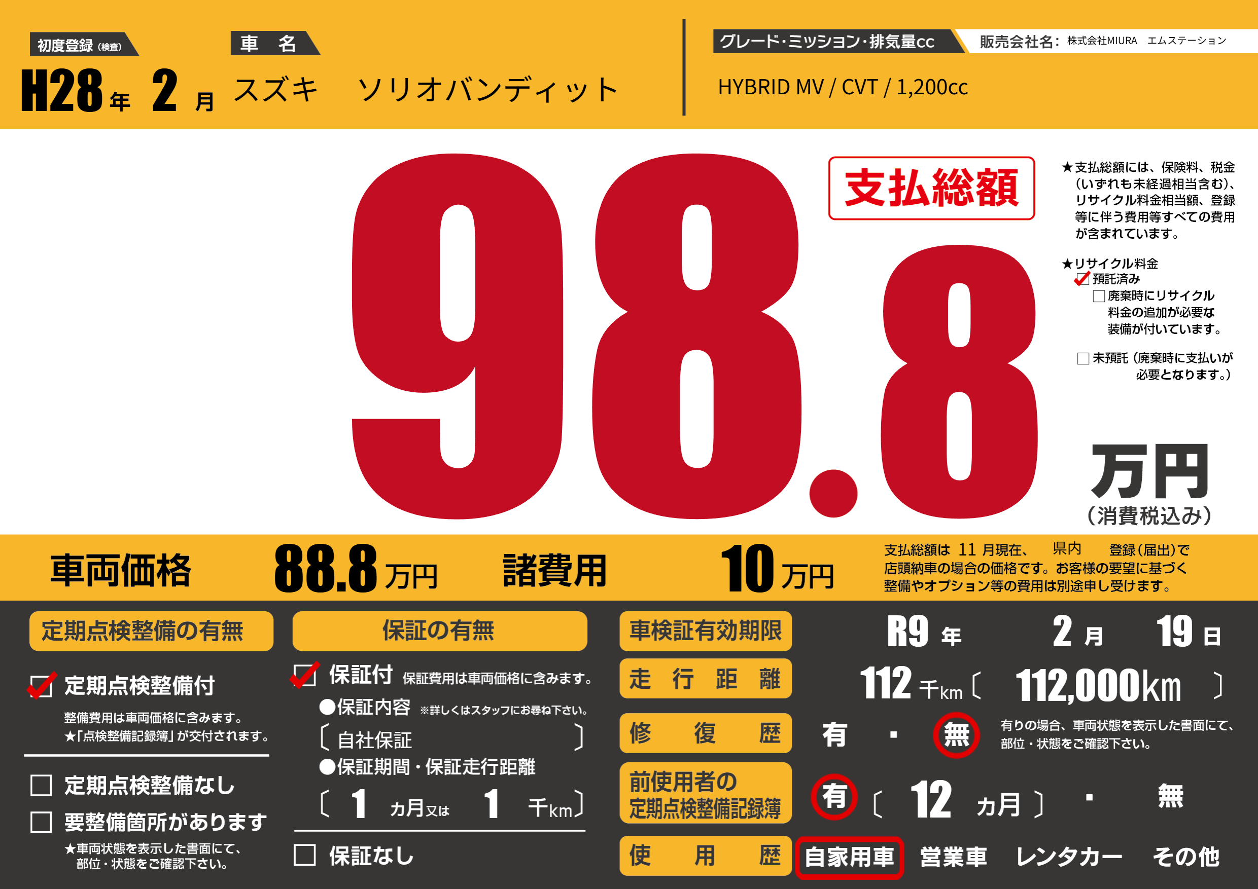 | 車名 | スズキ ソリオバンディット | グレード ミッション 排気量 |