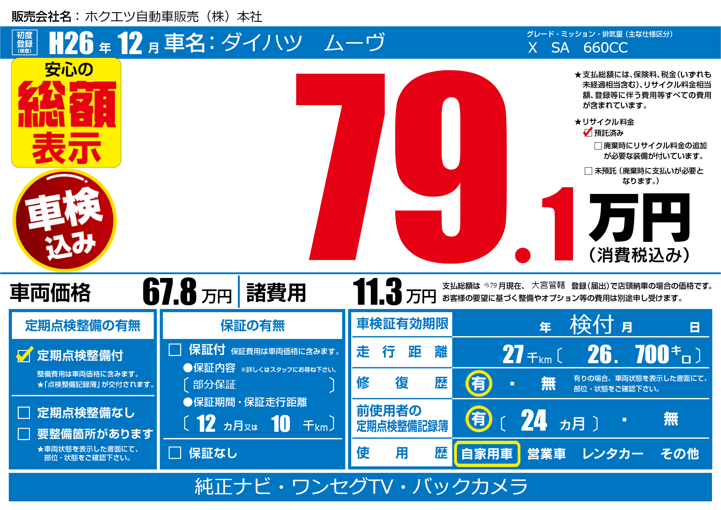 | 走行キロ | 2.7万km | 初年度登録 | H26年12月 |