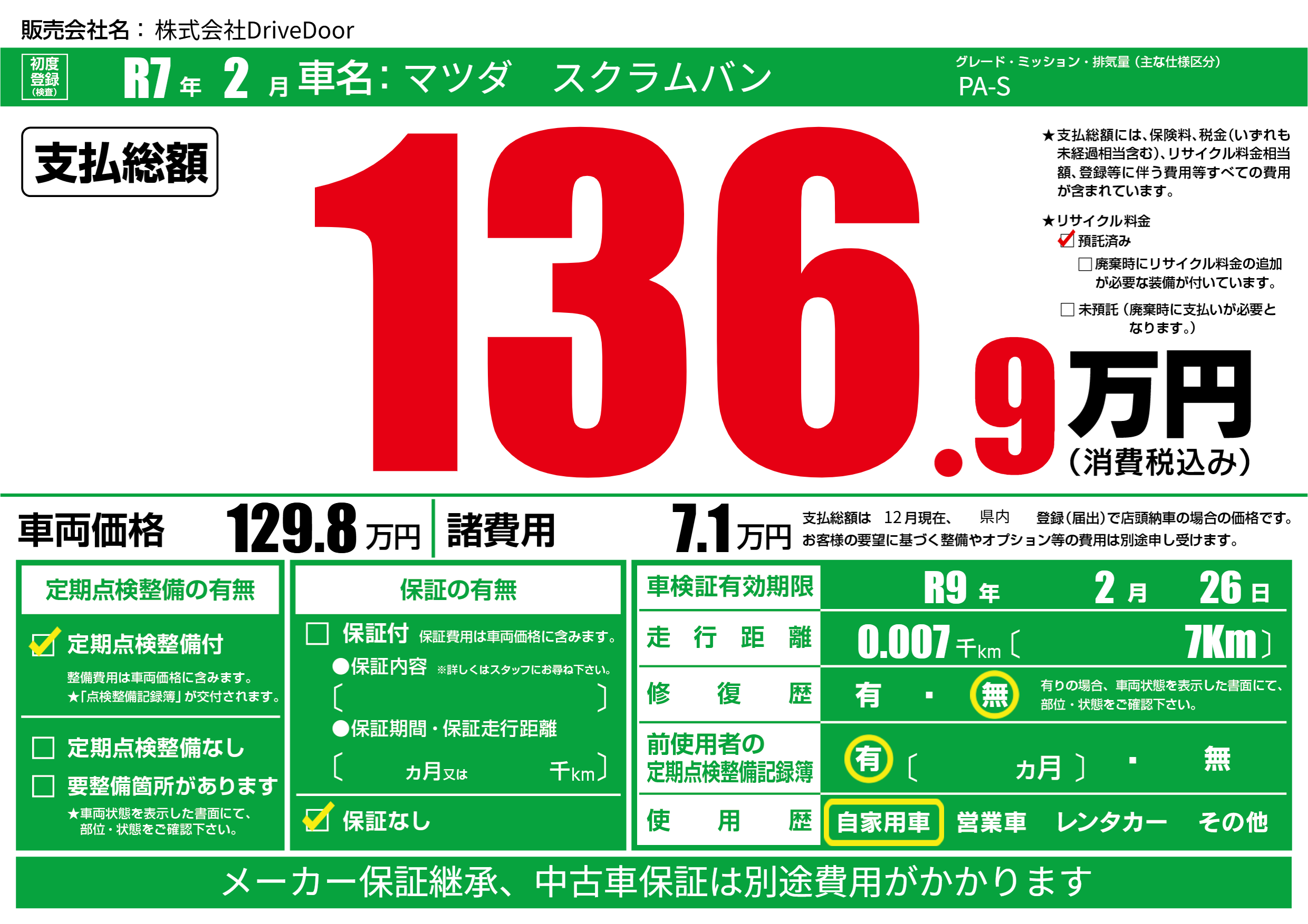 | 車検制限 | R9年 2月 26日 | ||