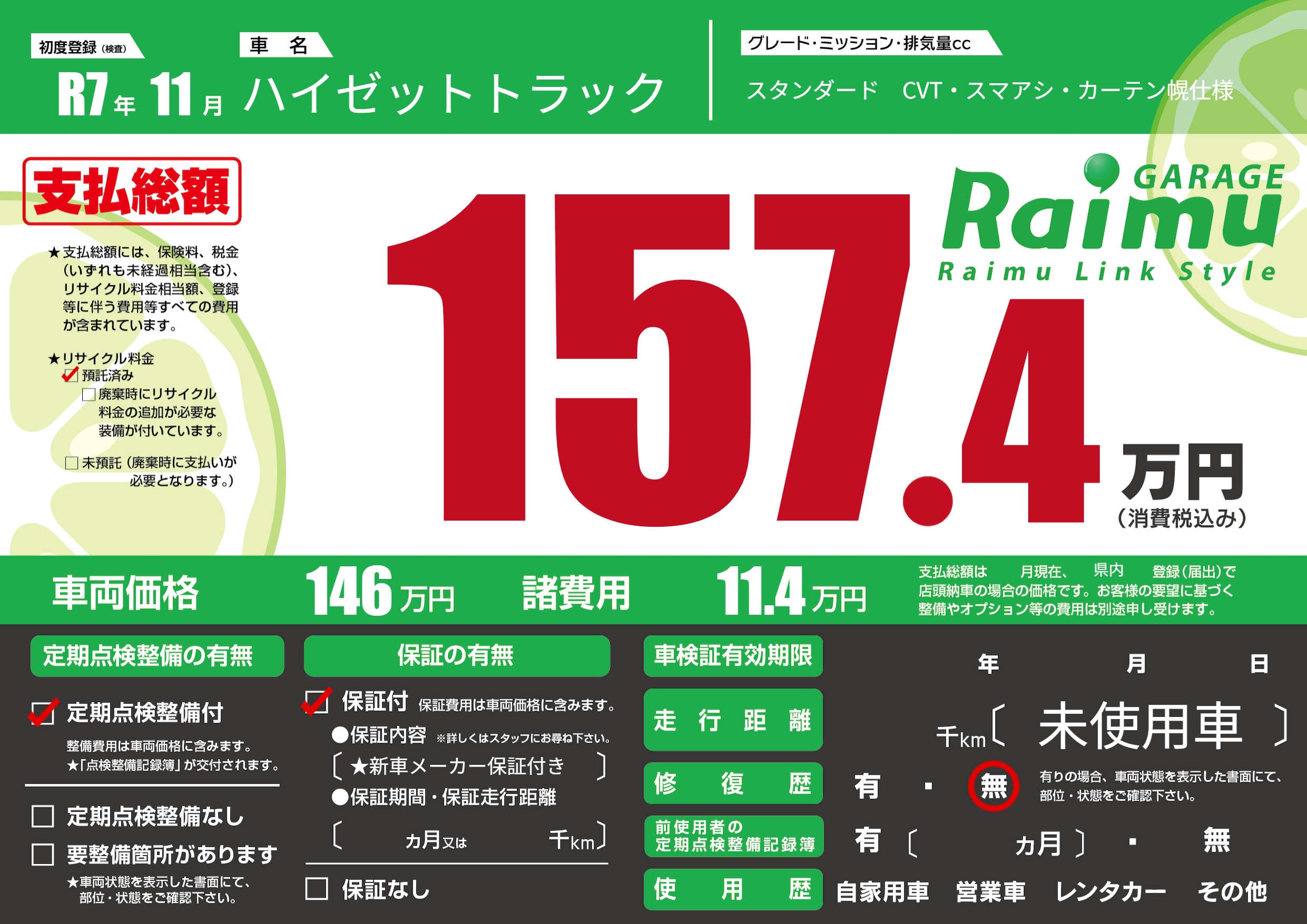 保証付き 保証内容(★新車メーカー保証付き) ヶ月または千km |