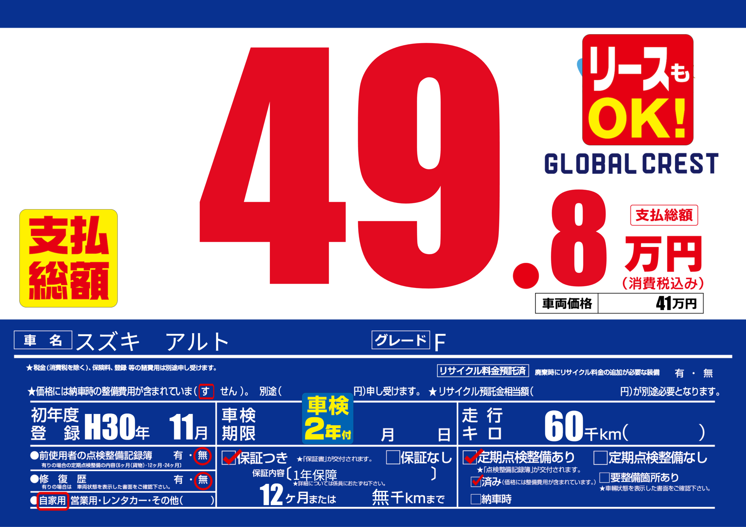 | 定期点検整備 | 定期点検整備あり 定期点検整備済み | ||