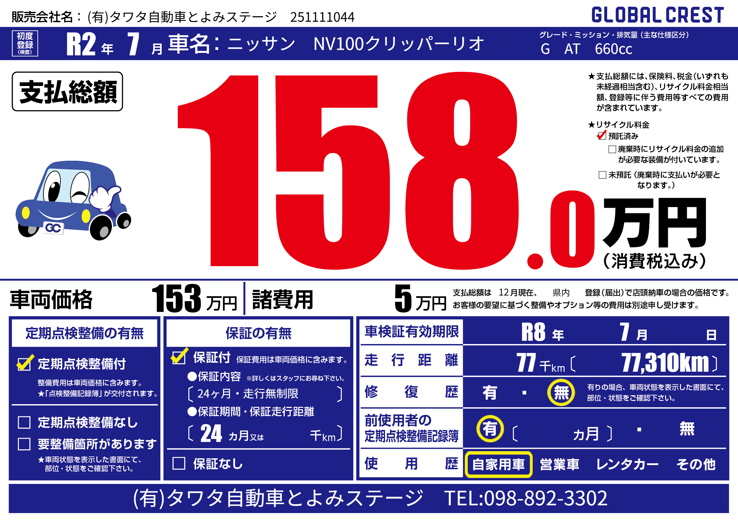 | 車検制限 | R8年 7月 - 日 | ||
