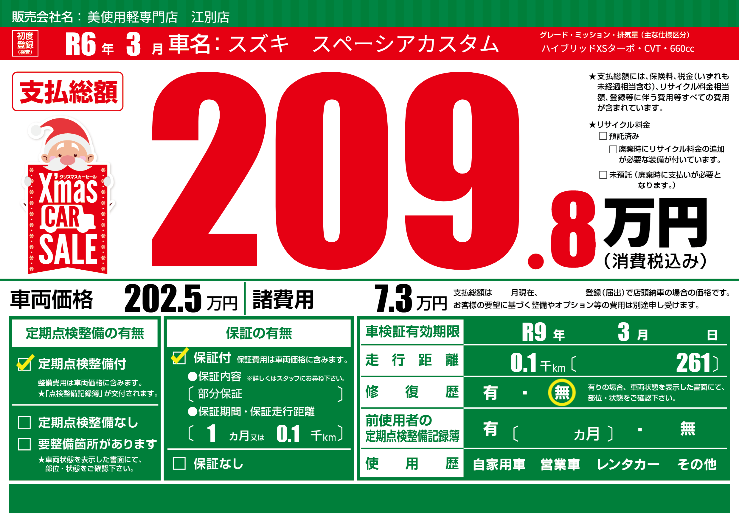 | 車名 | スズキ スペーシアカスタム | グレード ミッション 排気量 |