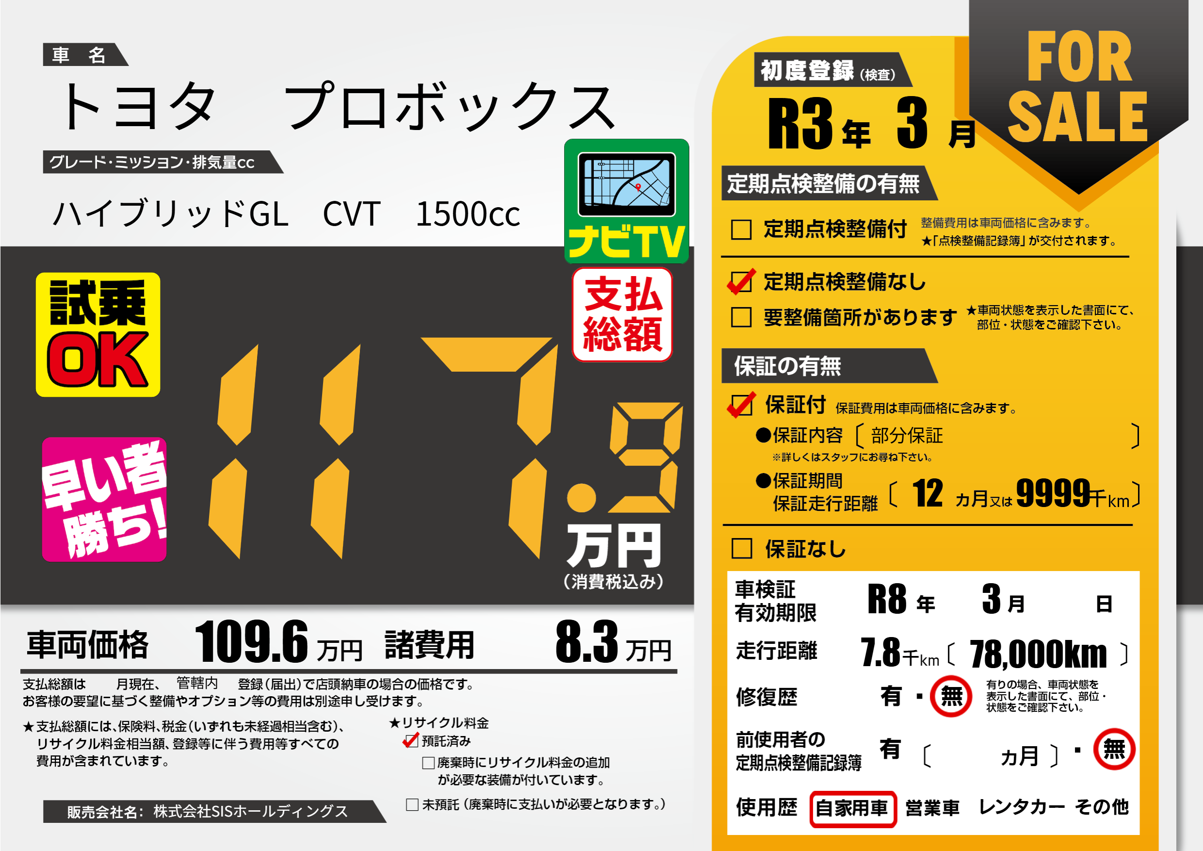 | 車名 | トヨタ プロボックス | グレード ミッション 排気量 |