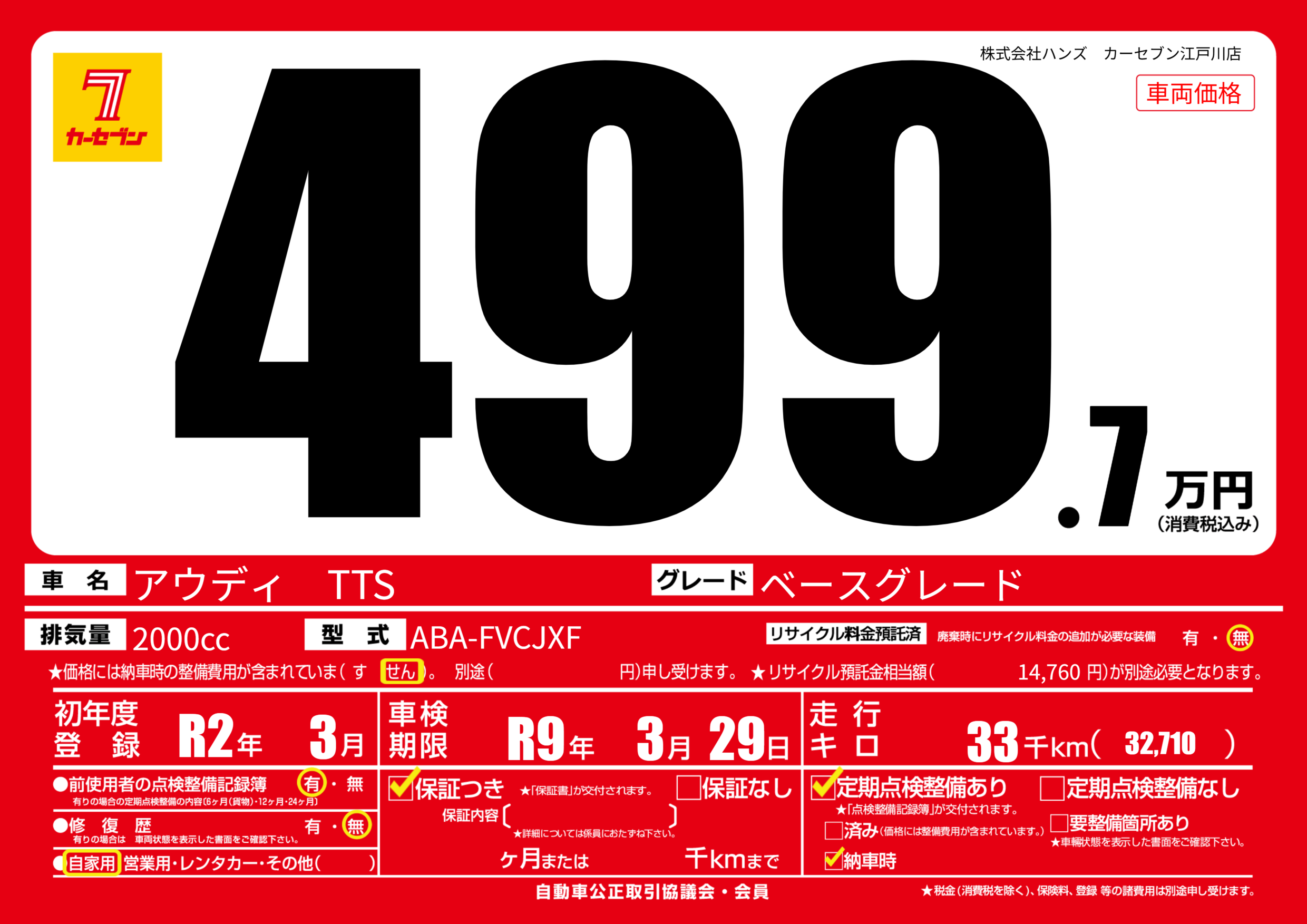 | 車名 | アウディ TTS | グレード ミッション 排気量 |