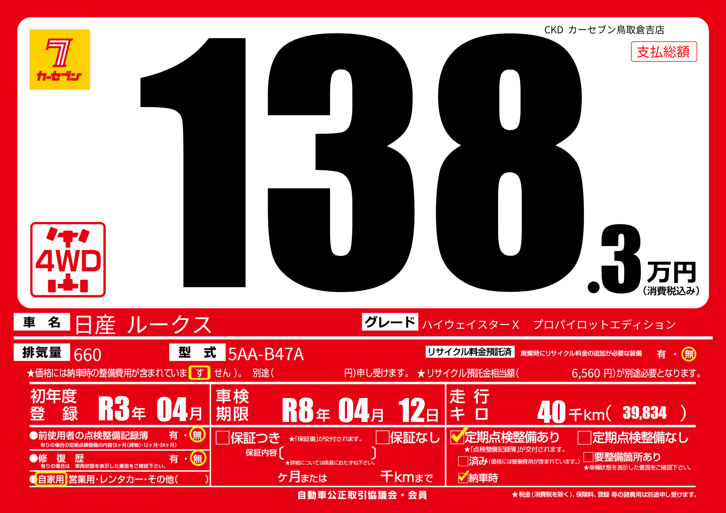 | 走行キロ | 4万km | 初年度登録 | R3年04月 |
