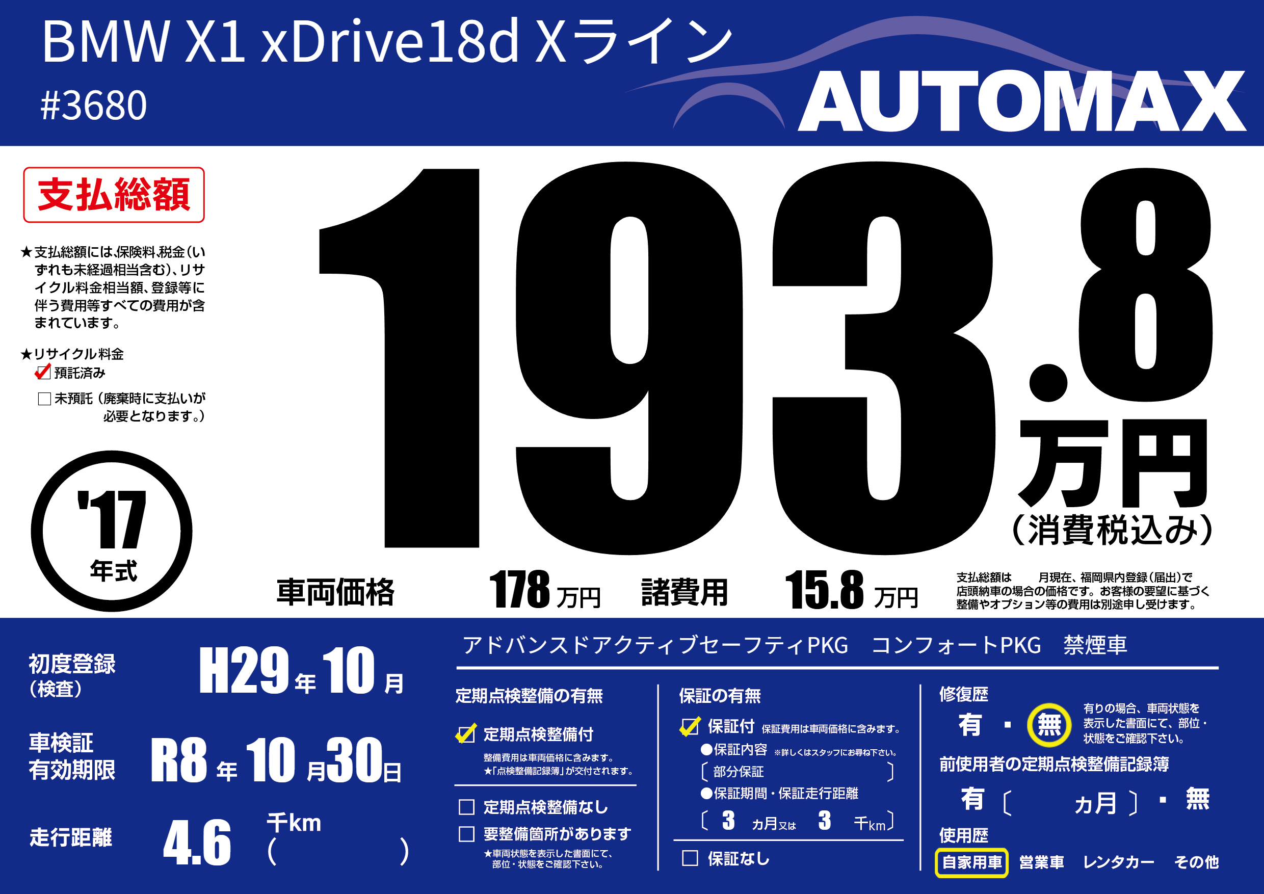 | 車検制限 | R8年 10月 30日 | ||