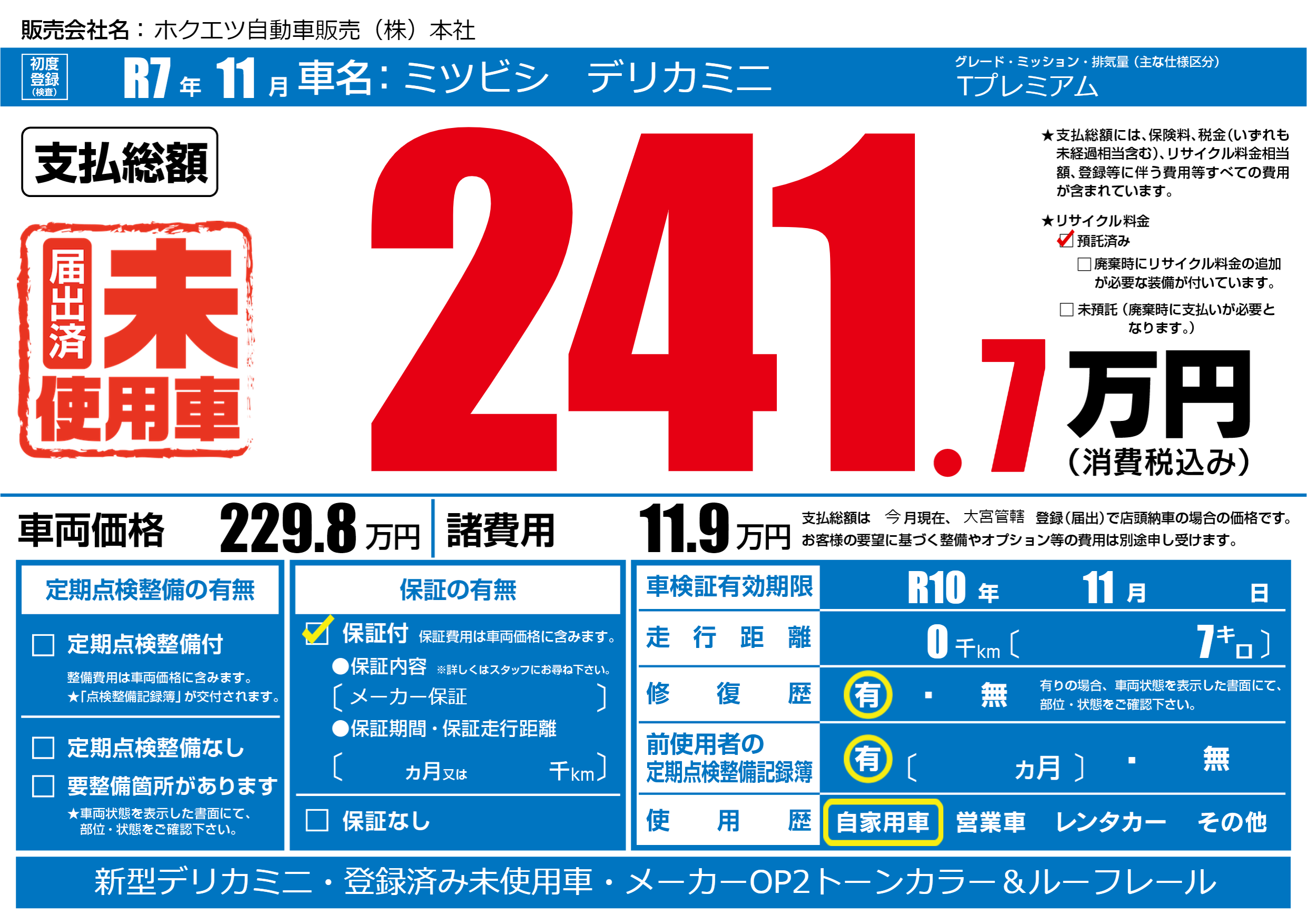 | 走行キロ | - | 初年度登録 | R7年11月 |