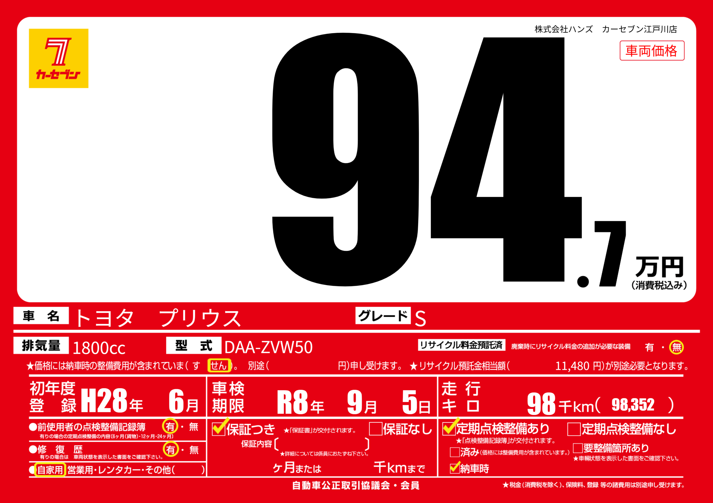 | 車名 | トヨタ プリウス | グレード ミッション 排気量 |