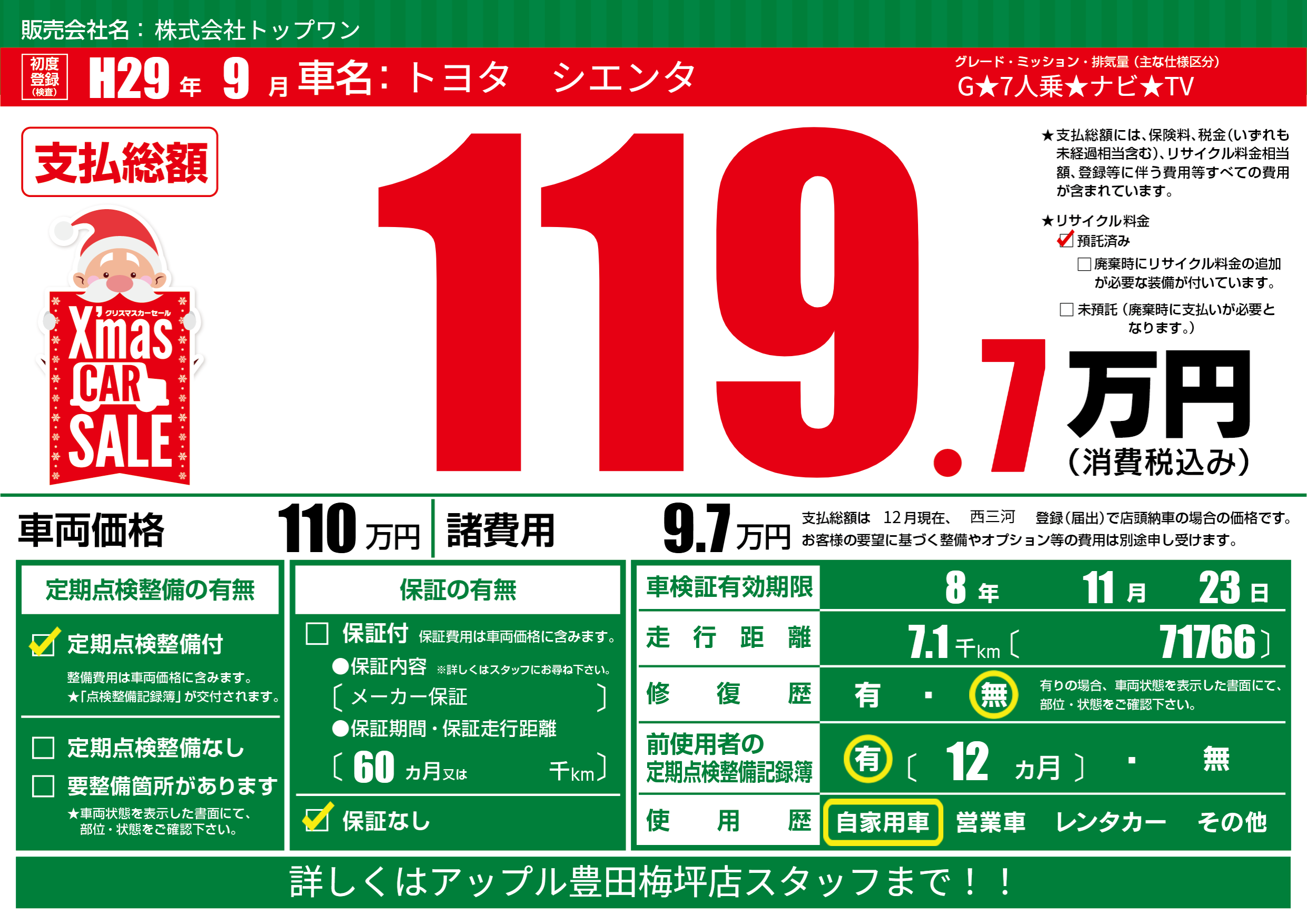 | 車名 | トヨタ シエンタ | グレード ミッション 排気量 |