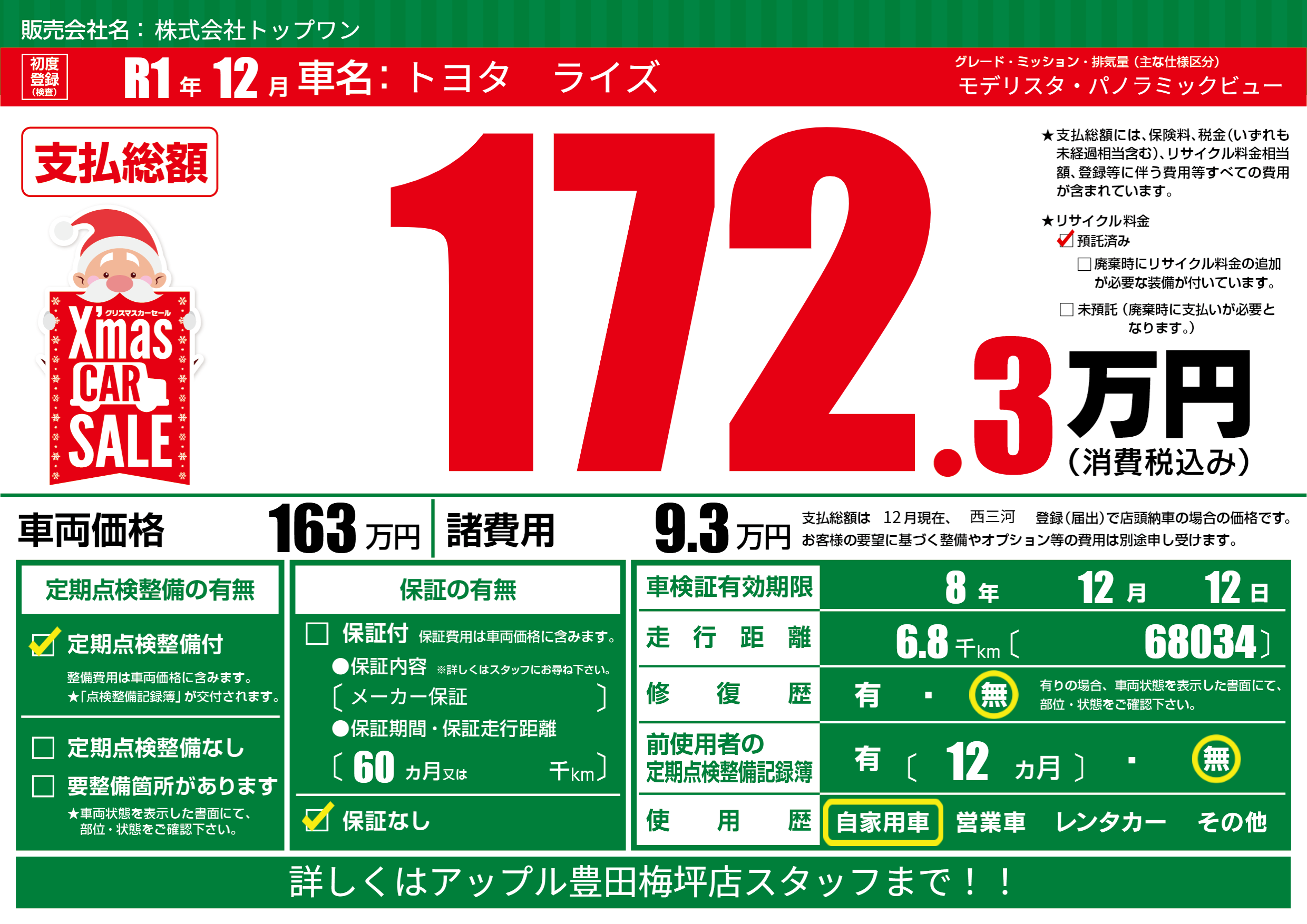 | 車名 | トヨタ ライズ | グレード ミッション 排気量 |