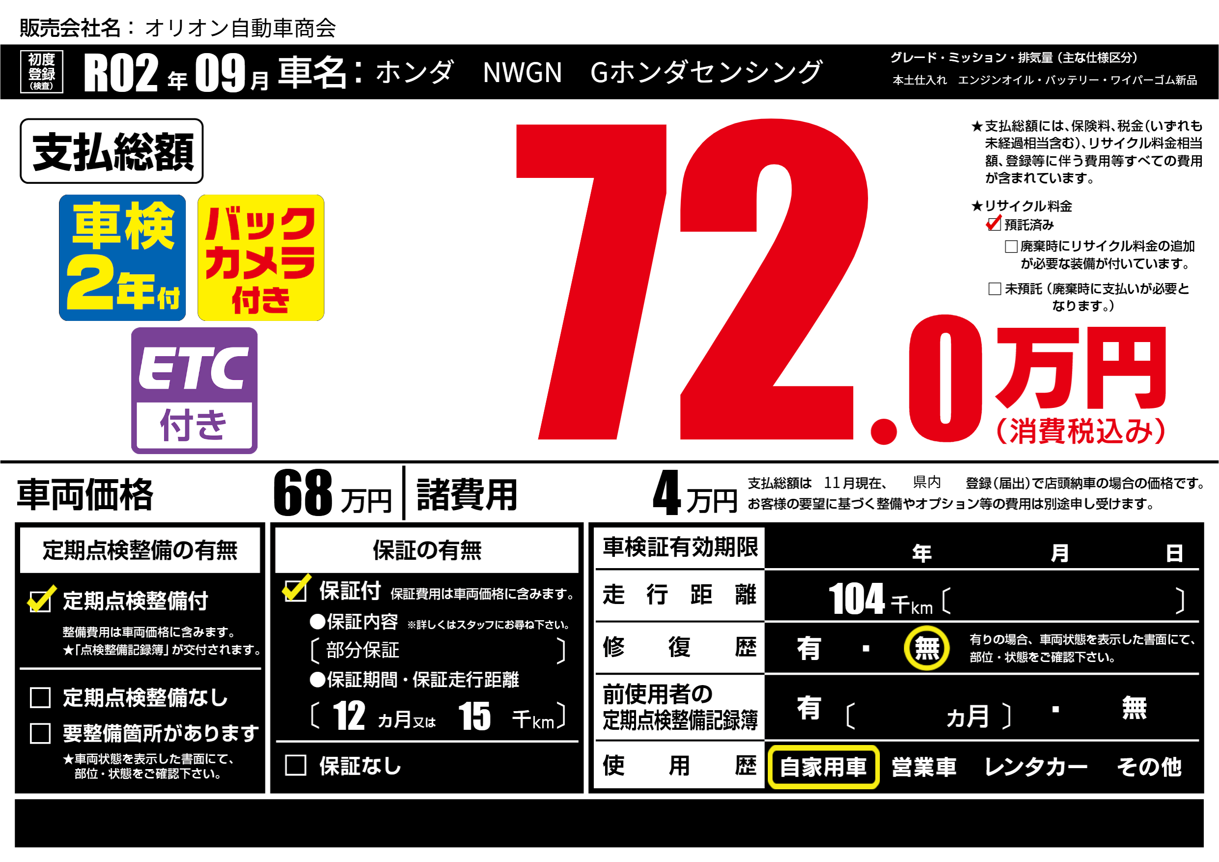 | 車名 | ホンダ NWGN Gホンダセンシング | グレード ミッション 排気量 |