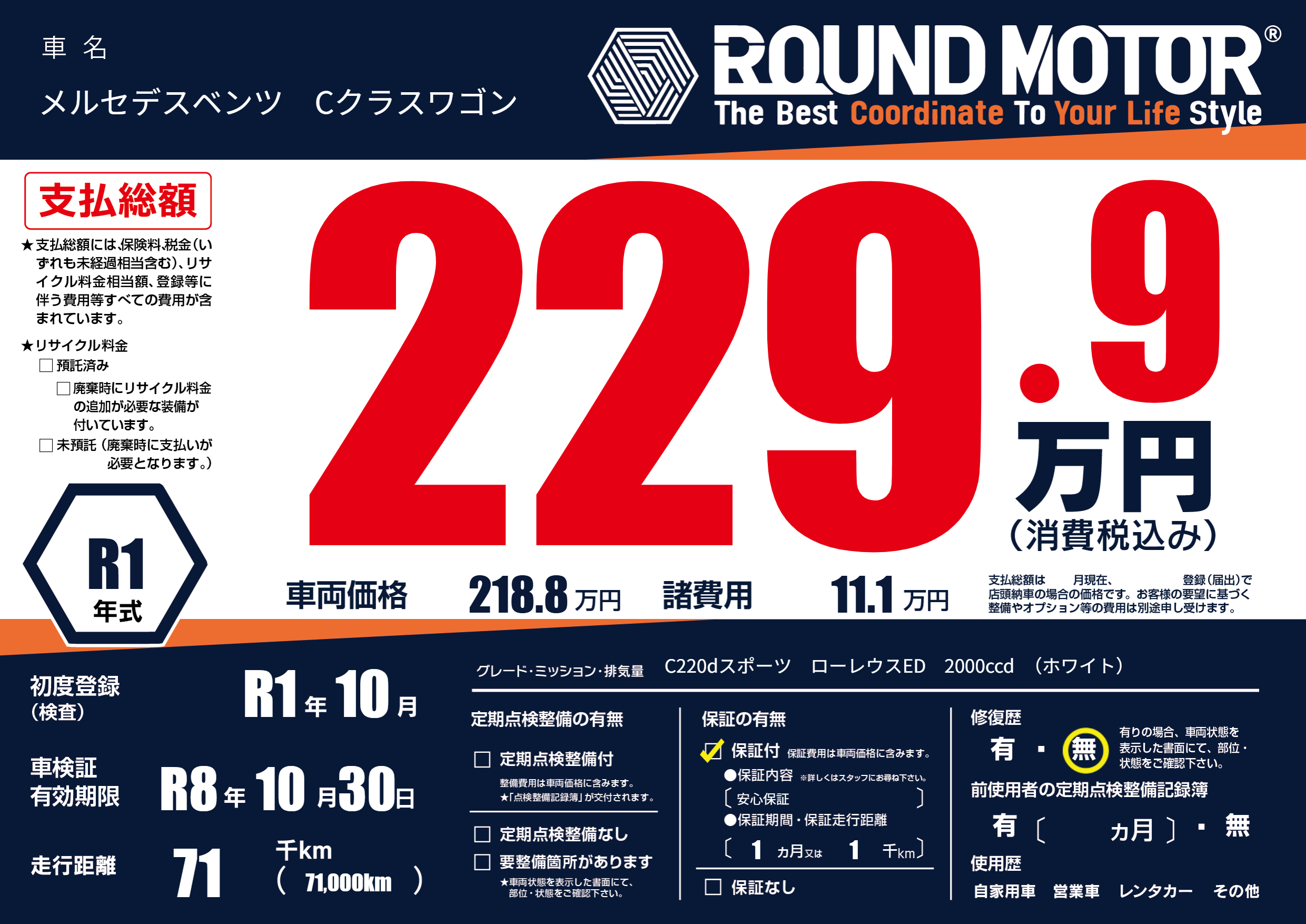 | 車名 | メルセデスベンツ Cクラスワゴン | グレード ミッション 排気量 |