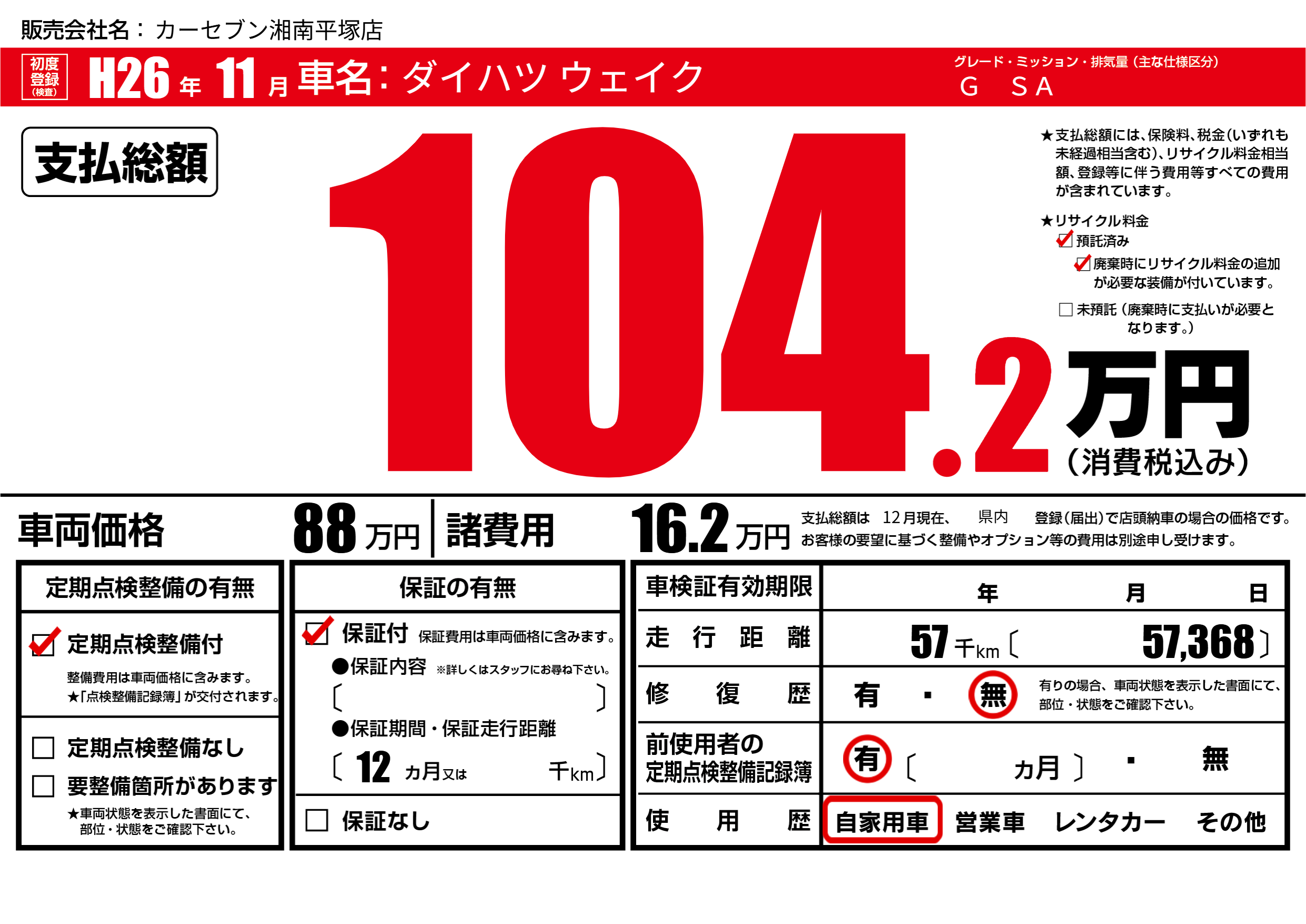 | 走行キロ | 5.7万km | 初年度登録 | H26年11月 |