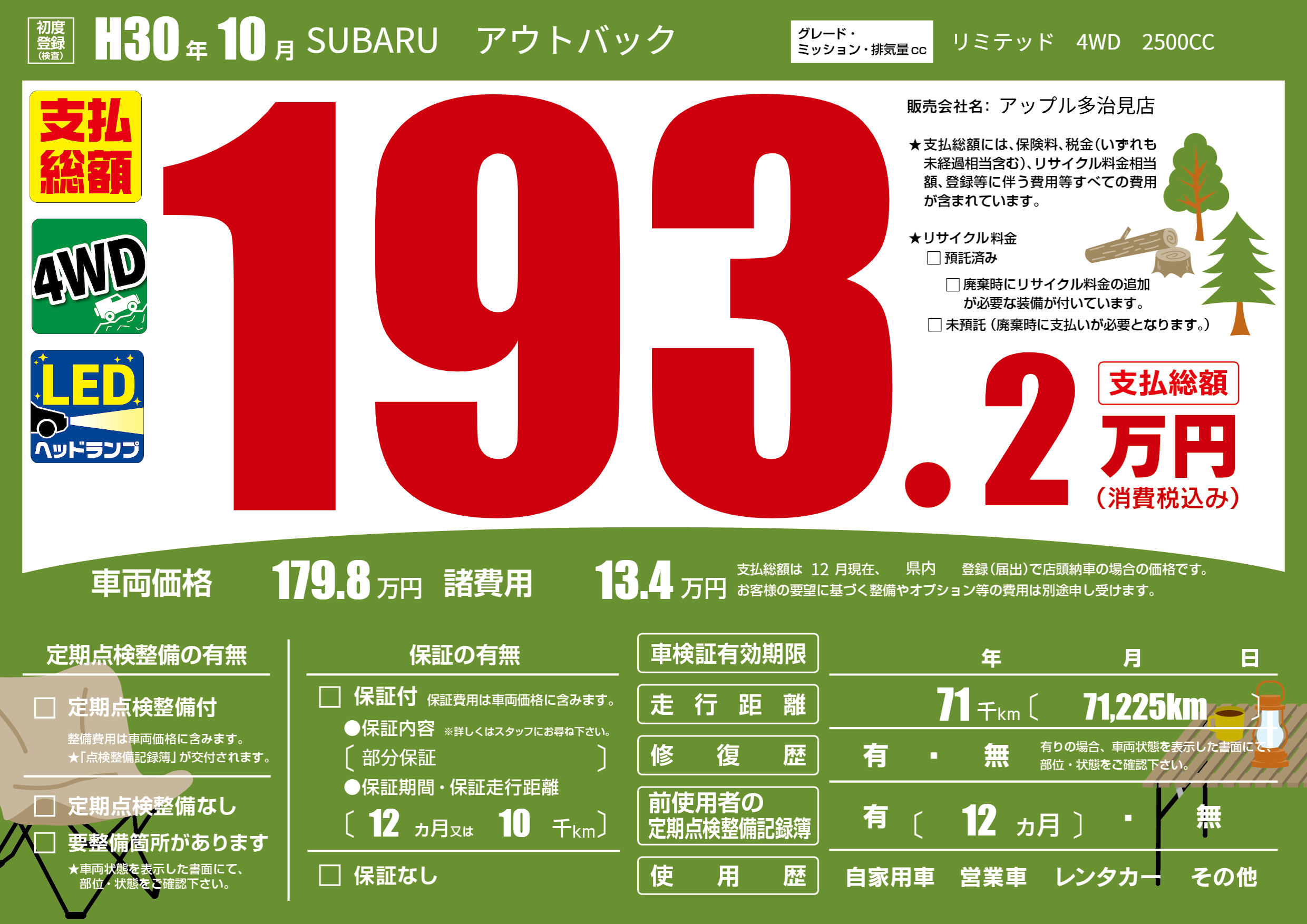 | 車名 | SUBARU アウトバック | グレード ミッション 排気量 |