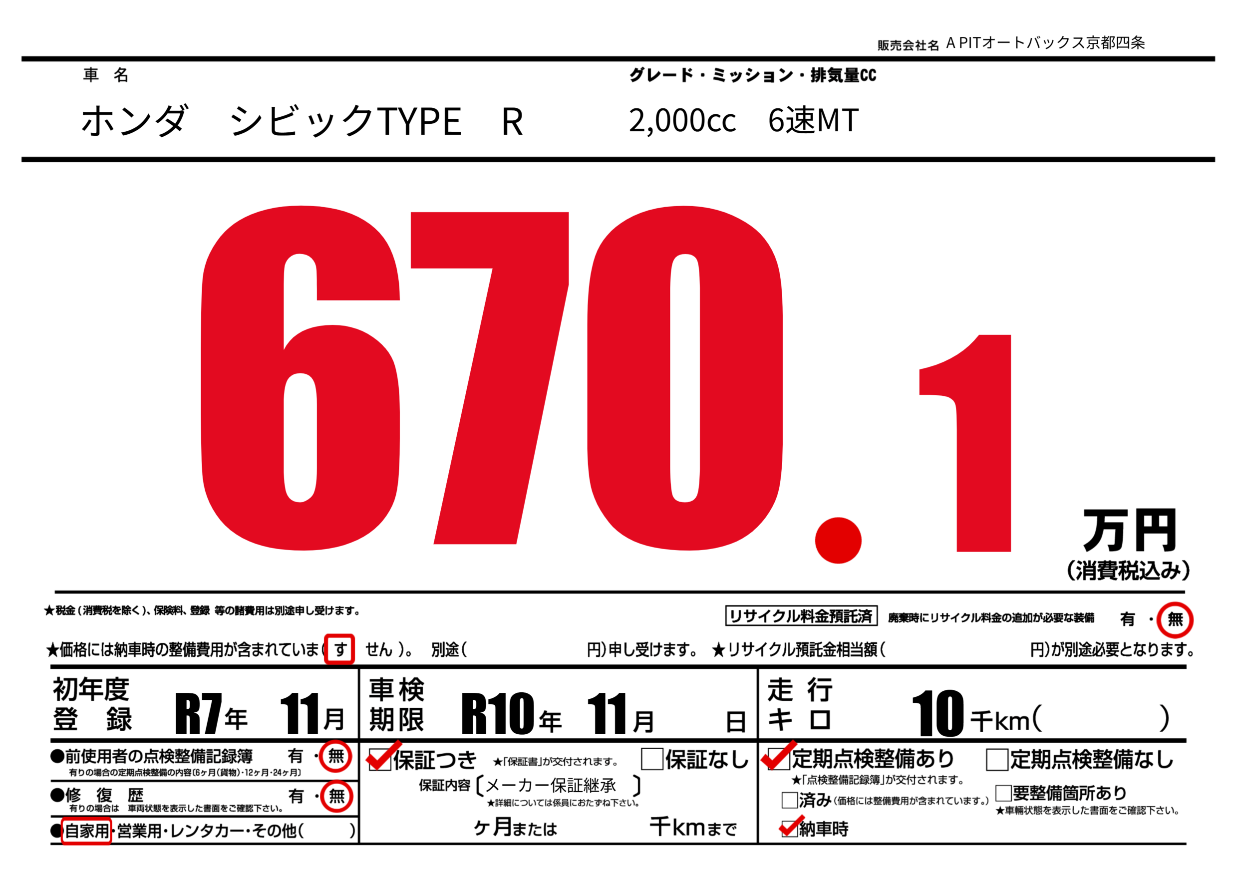 | 車名 | ホンダ シビックTYPE R | グレード ミッション 排気量 |