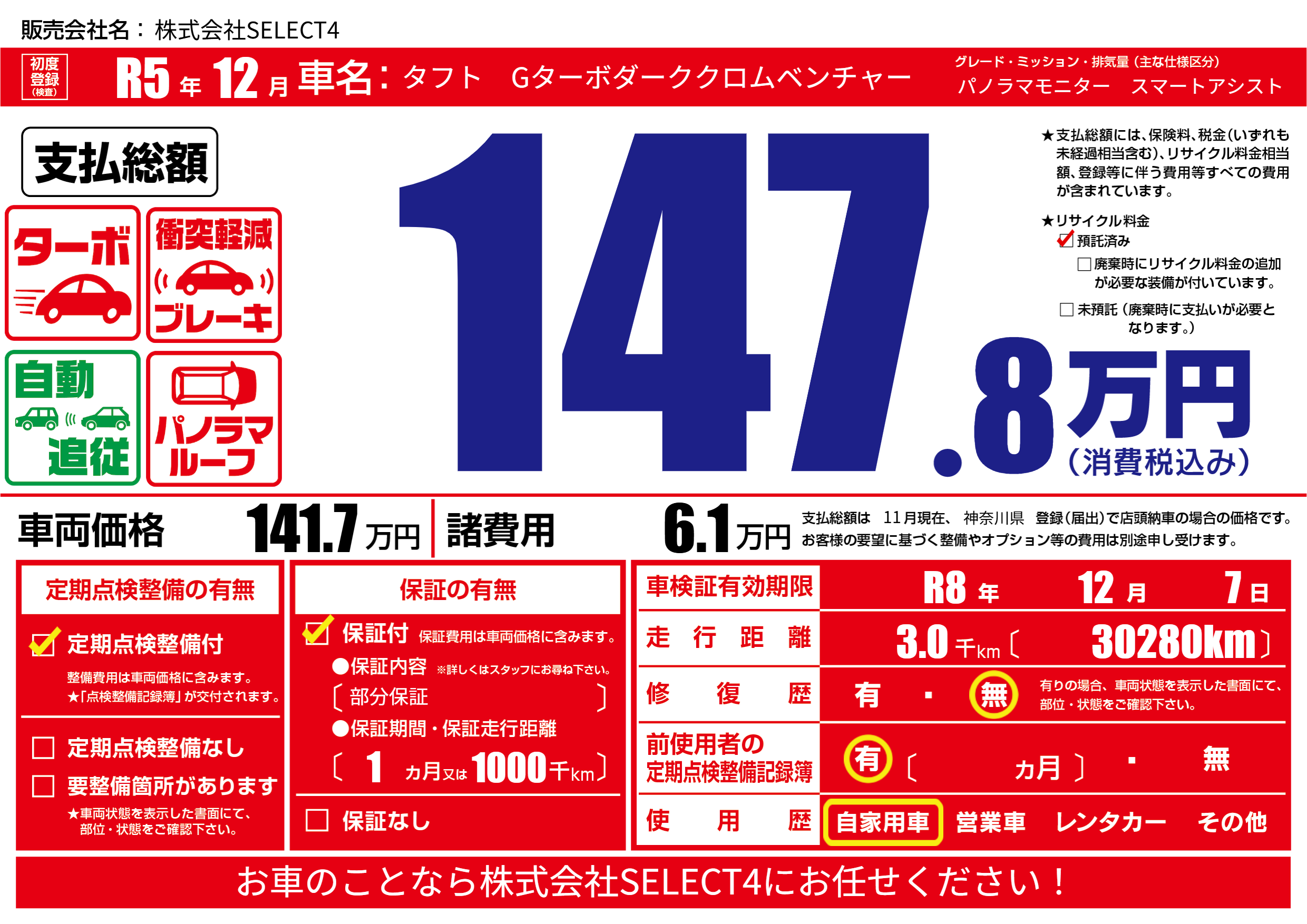 | 走行キロ | 0.3万km | 初年度登録 | R5年12月 |