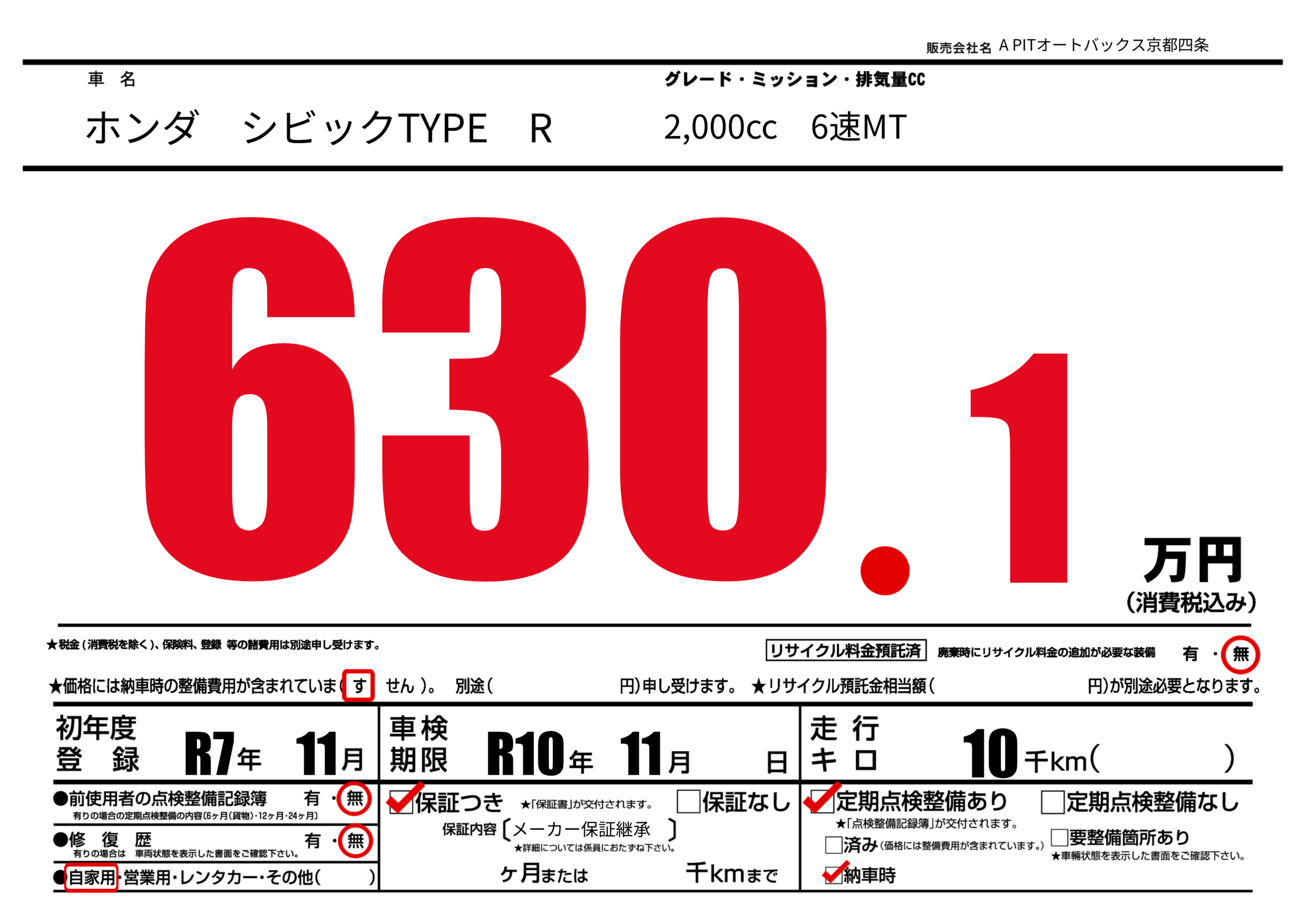 | 車名 | ホンダ シビックTYPE R | グレード ミッション 排気量 |