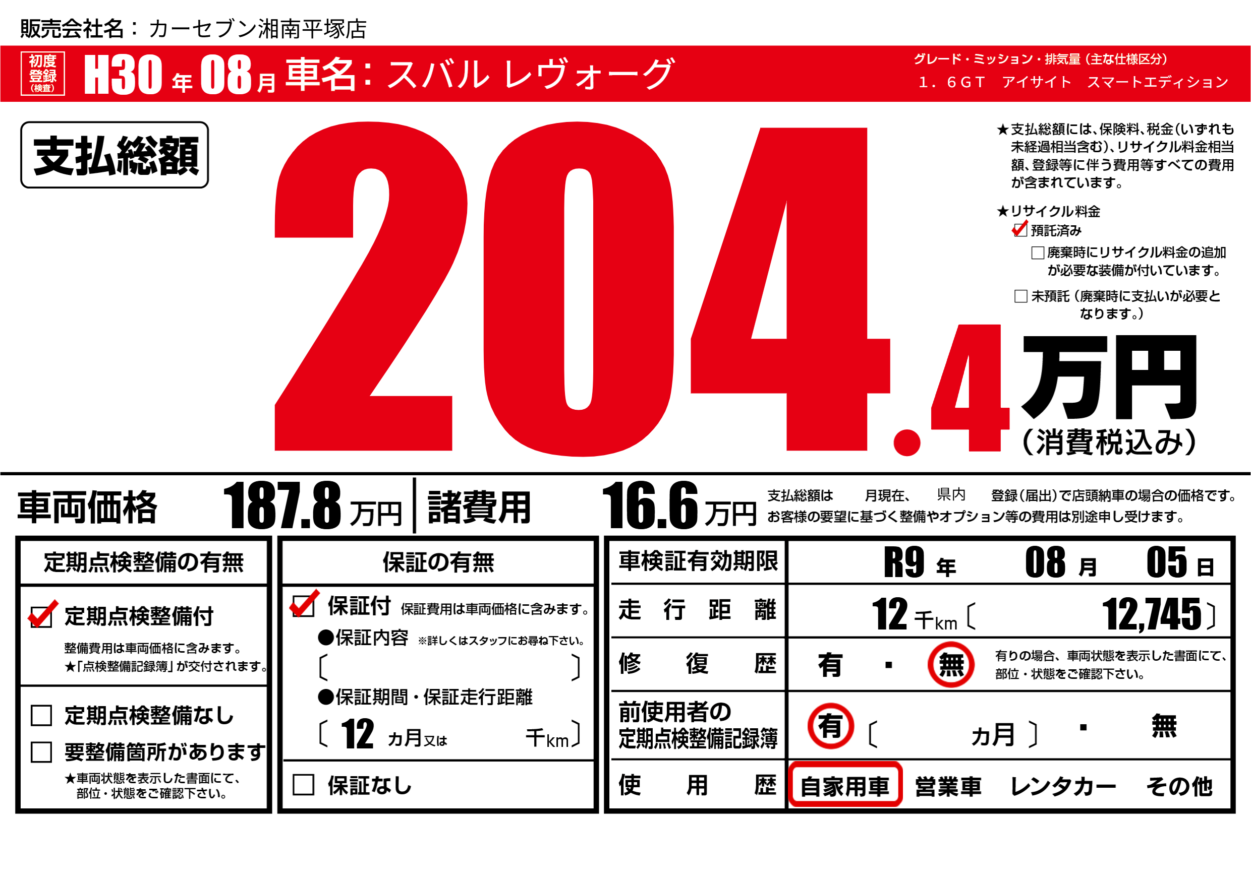 | 車名 | スバル レヴォーグ | グレード ミッション 排気量 |