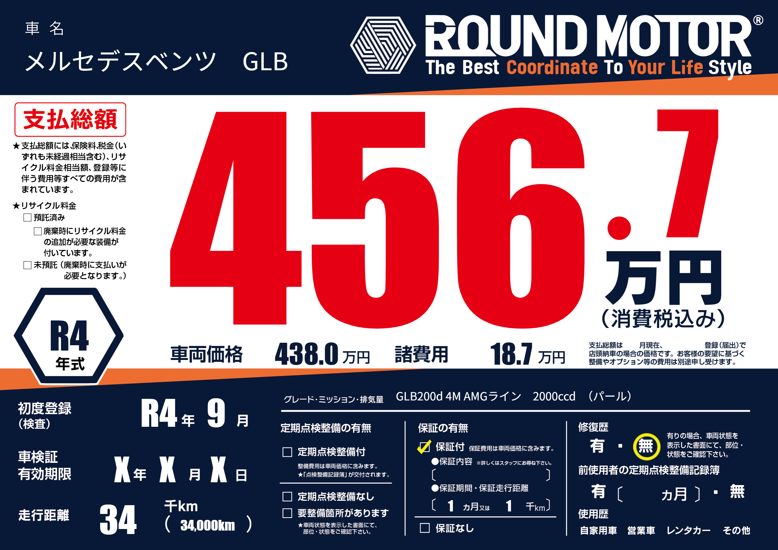 | 車名 | メルセデスベンツ GLB | グレード ミッション 排気量 |