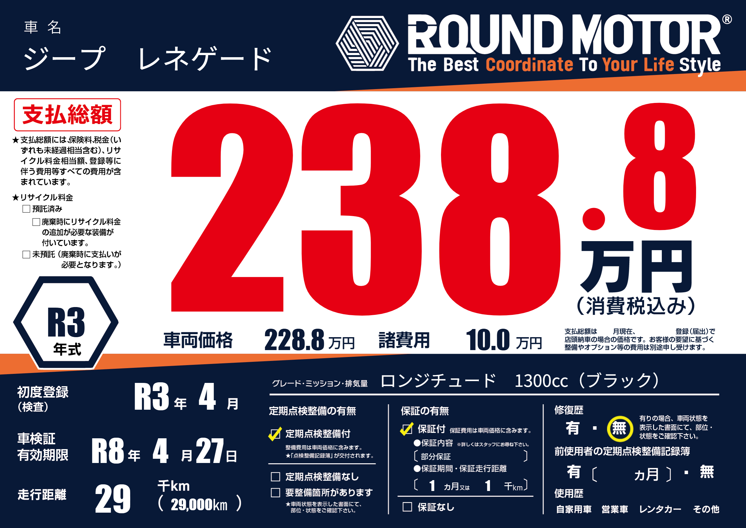 | 車名 | ジープ レネゲード | グレード ミッション 排気量 |