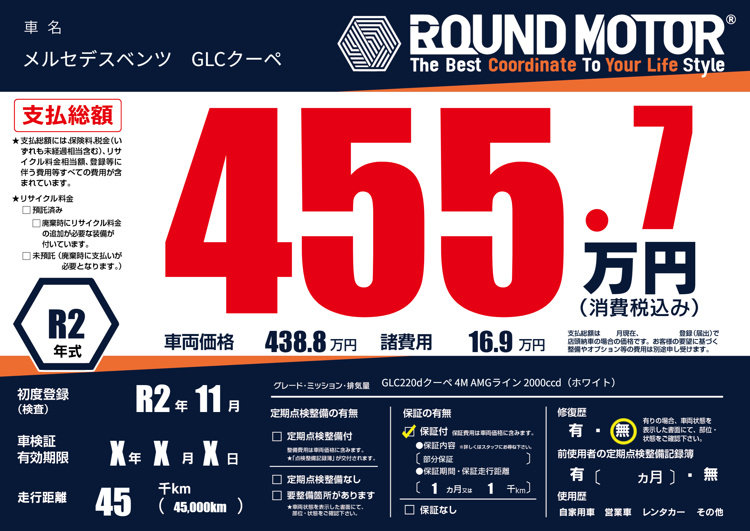 | 車名 | メルセデスベンツ GLCクーペ | グレード ミッション 排気量 |