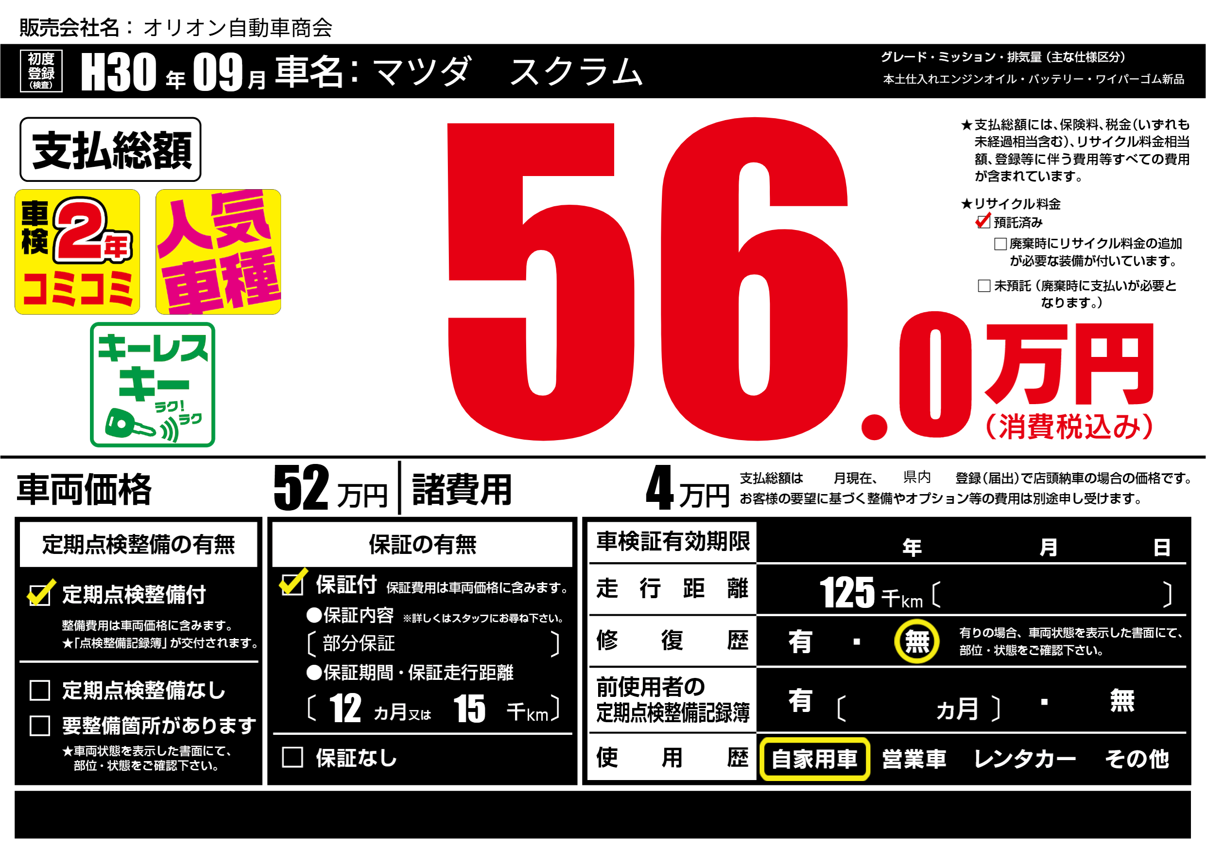 | 走行キロ | 12.5万km | 初年度登録 | H30年09月 |