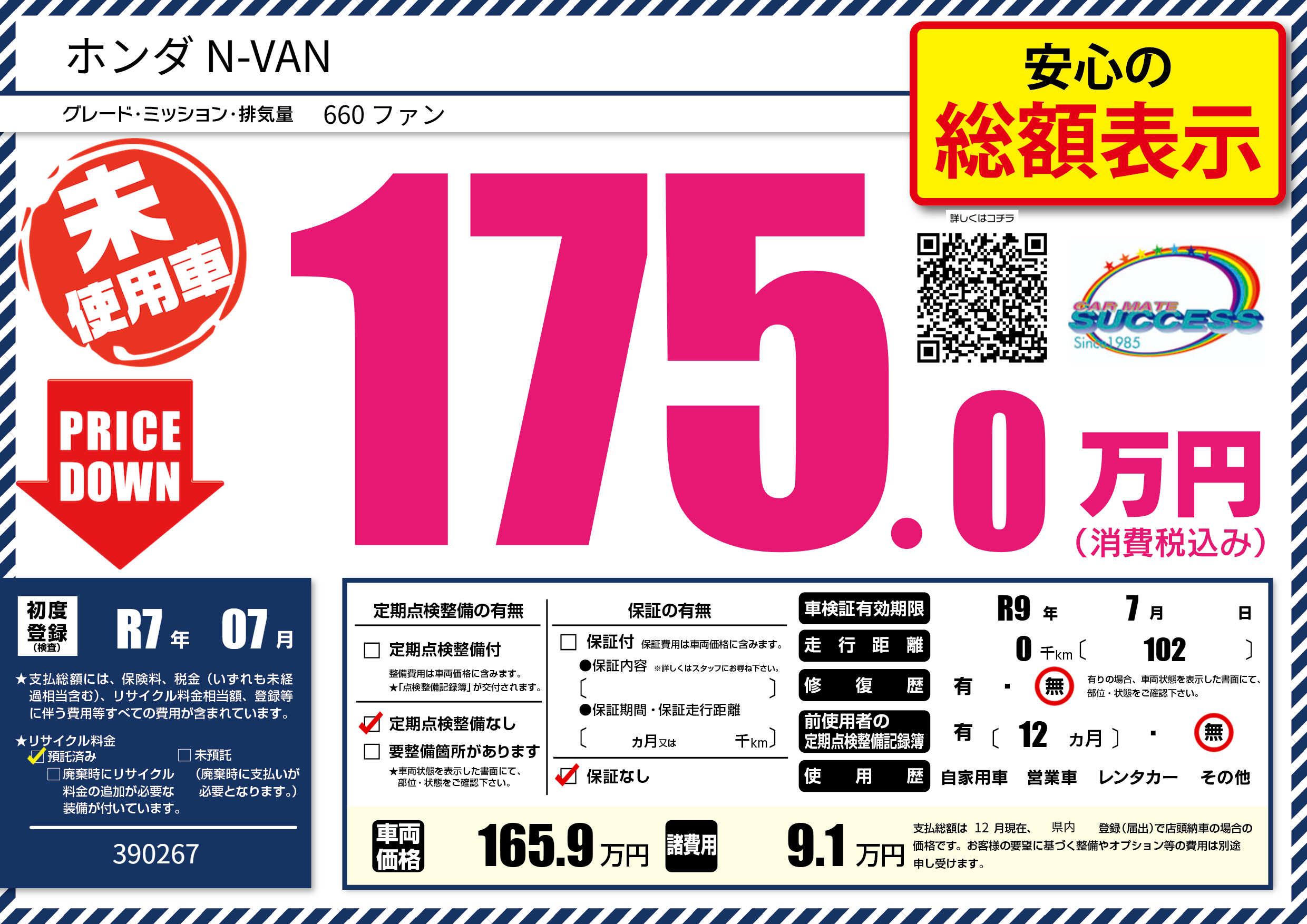 | 車名 | ホンダ N-VAN | グレード ミッション 排気量 |