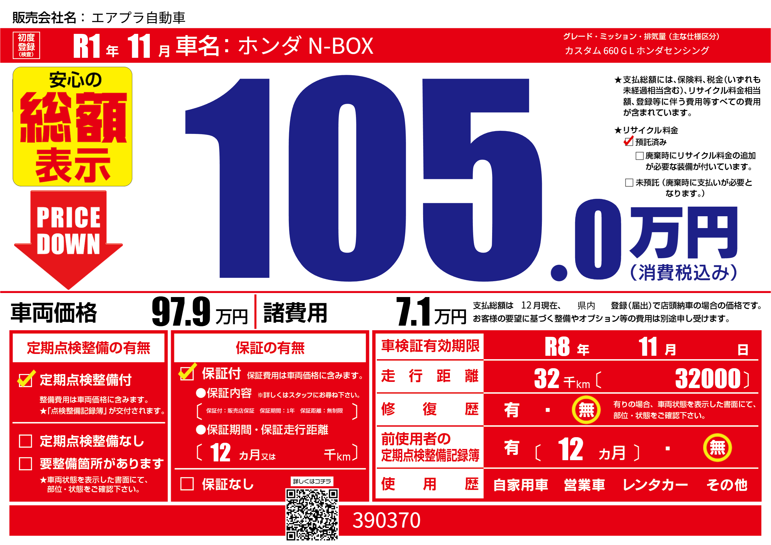 | 車検制限 | R8年 11月 - 日 | ||