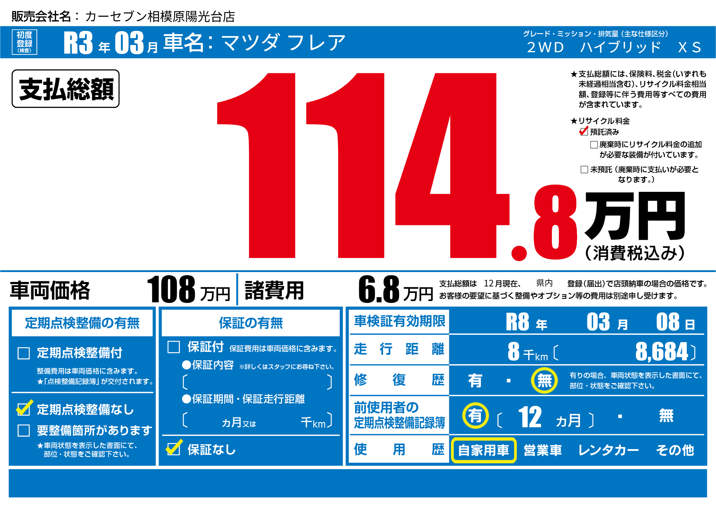 | 走行キロ | 0.8万km | 初年度登録 | R3年03月 |