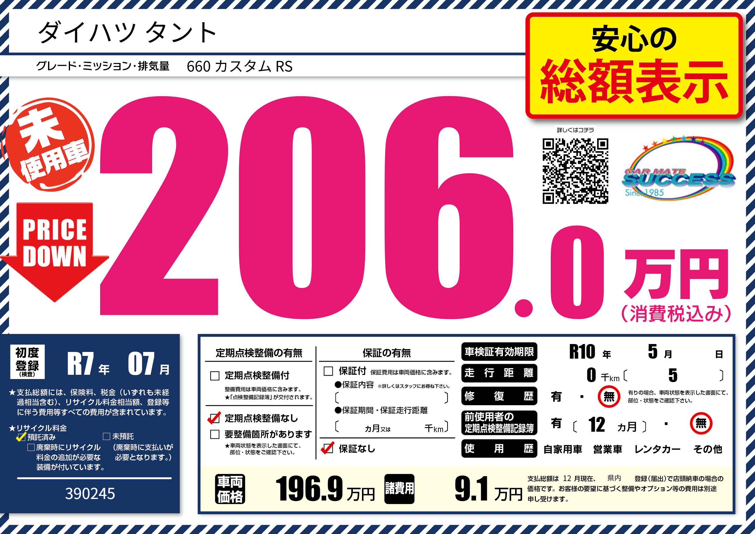| 走行キロ | - | 初年度登録 | R7年07月 |