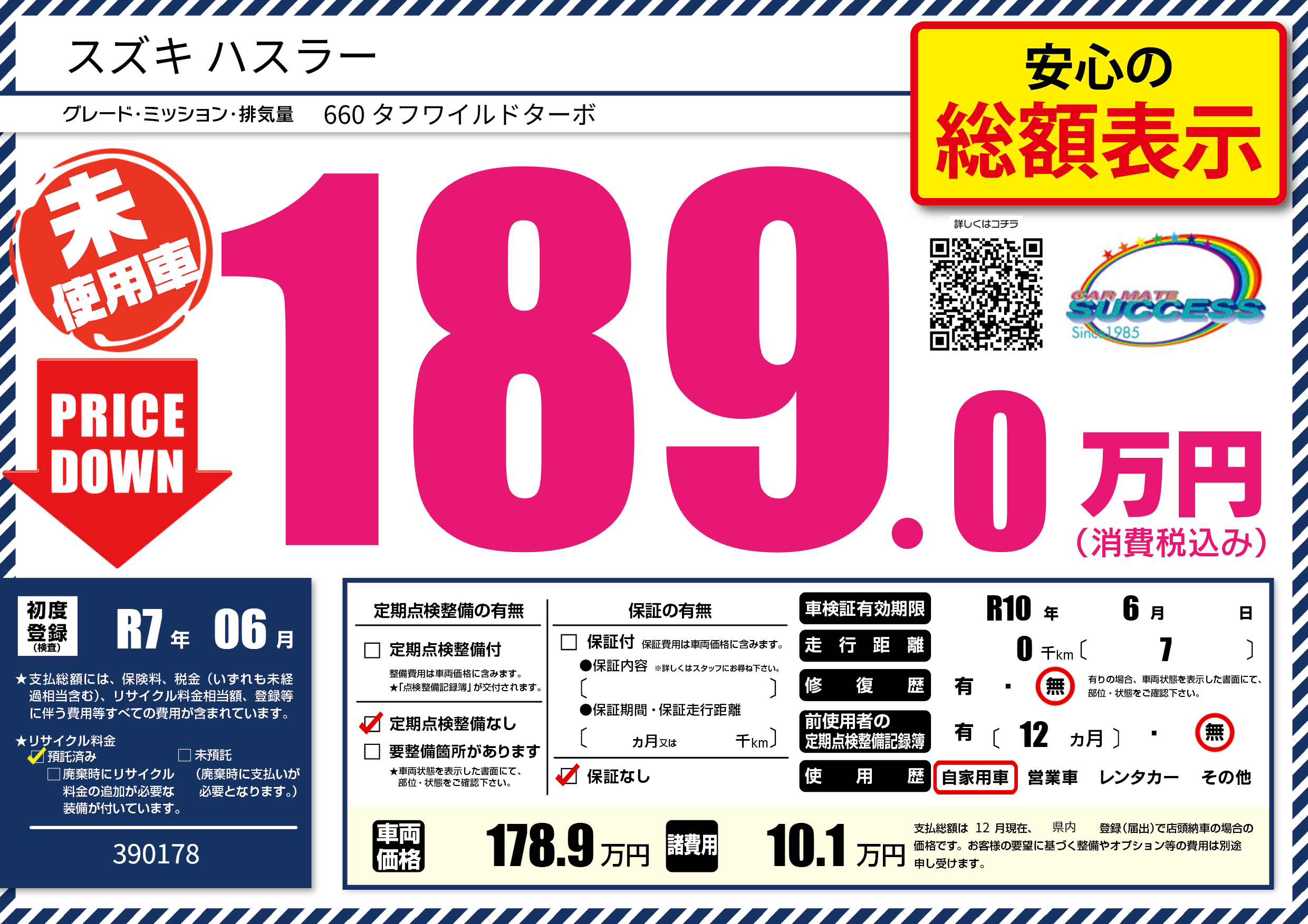 | 車名 | スズキ ハスラー | グレード ミッション 排気量 |