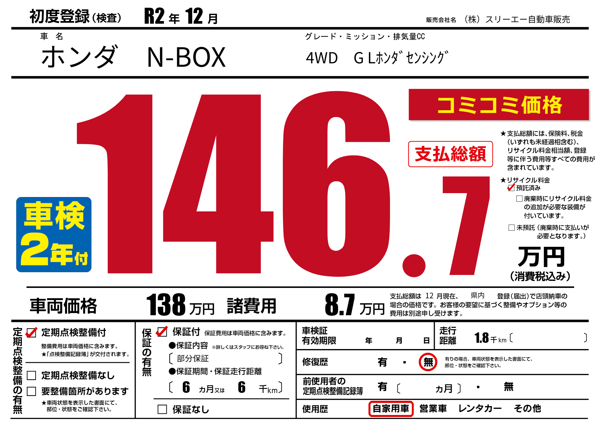 | 車名 | ホンダ N-BOX | グレード ミッション 排気量 |