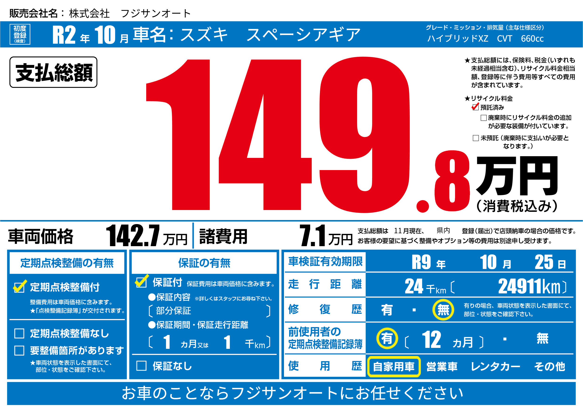| 走行キロ | 2.4万km | 初年度登録 | R2年10月 |