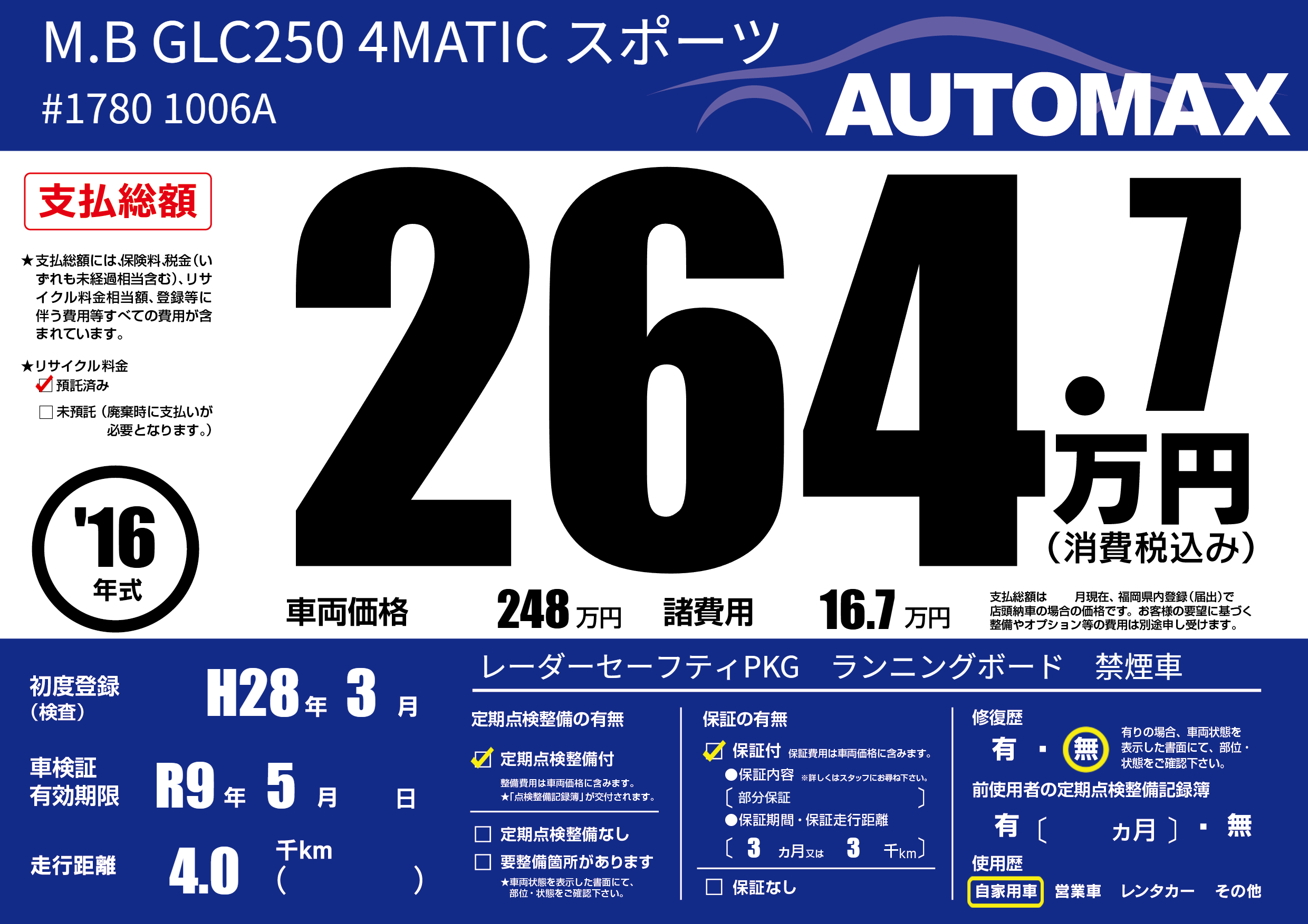 | 車名 | M.B GLC250 4MATIC スポーツ | グレード ミッション 排気量 |