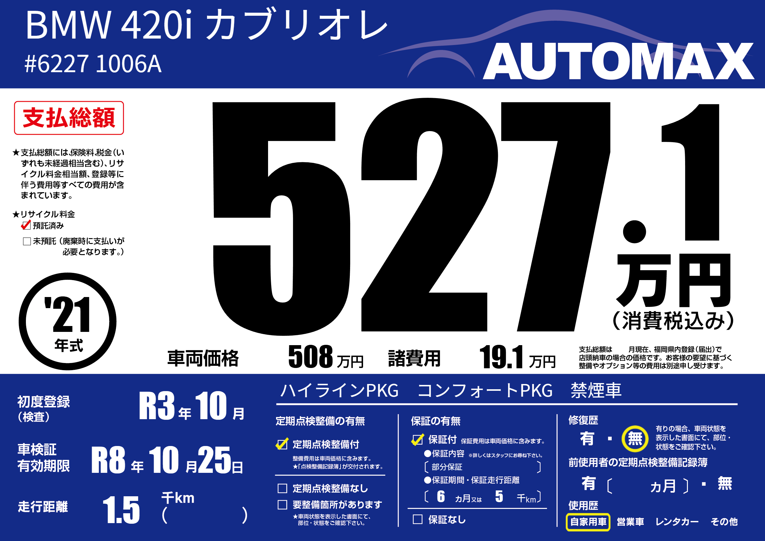 | 車名 | BMW 420i カブリオレ | グレード ミッション 排気量 |