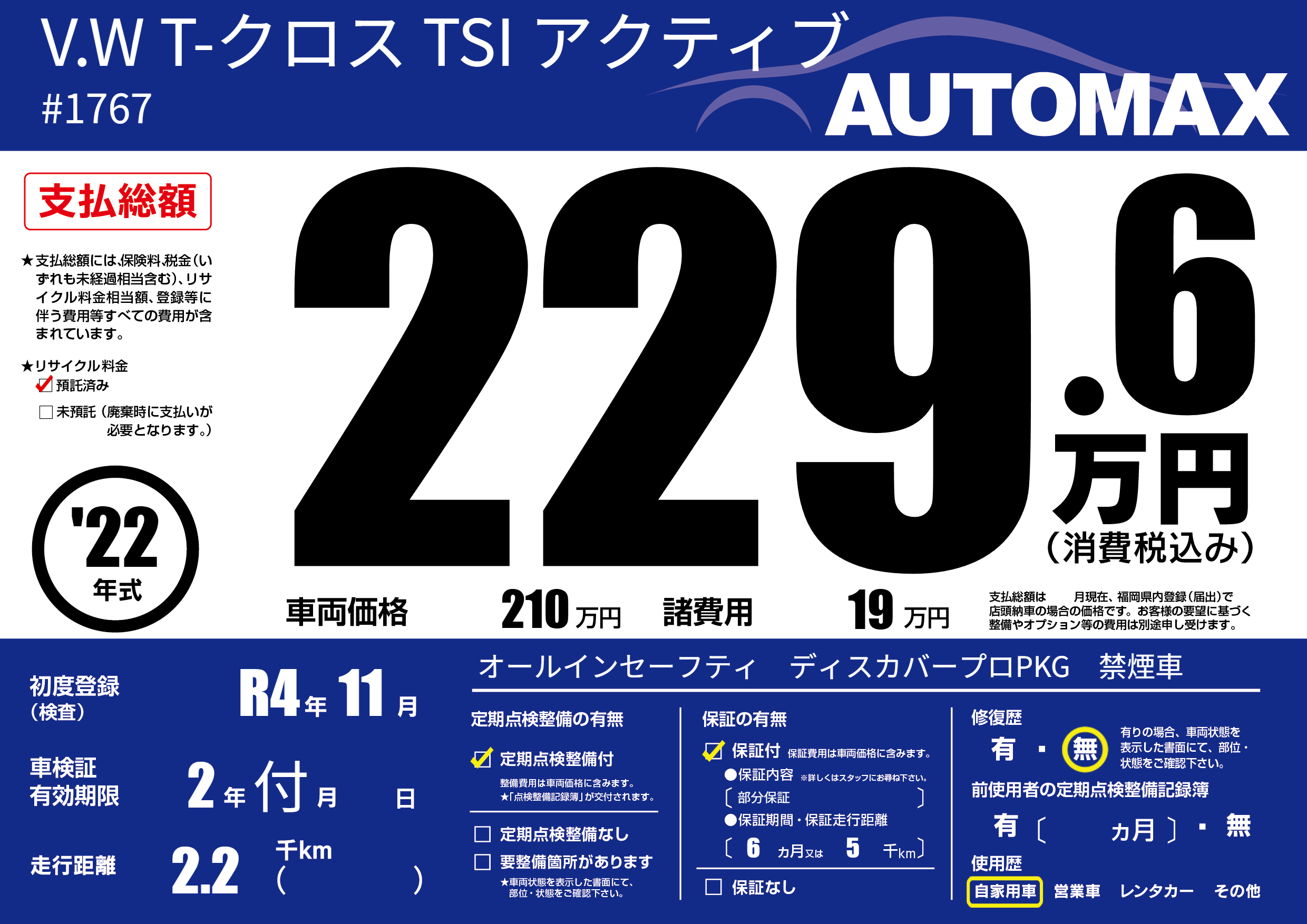 | 車名 | V.W T-クロス TSI アクティブ | グレード ミッション 排気量 |