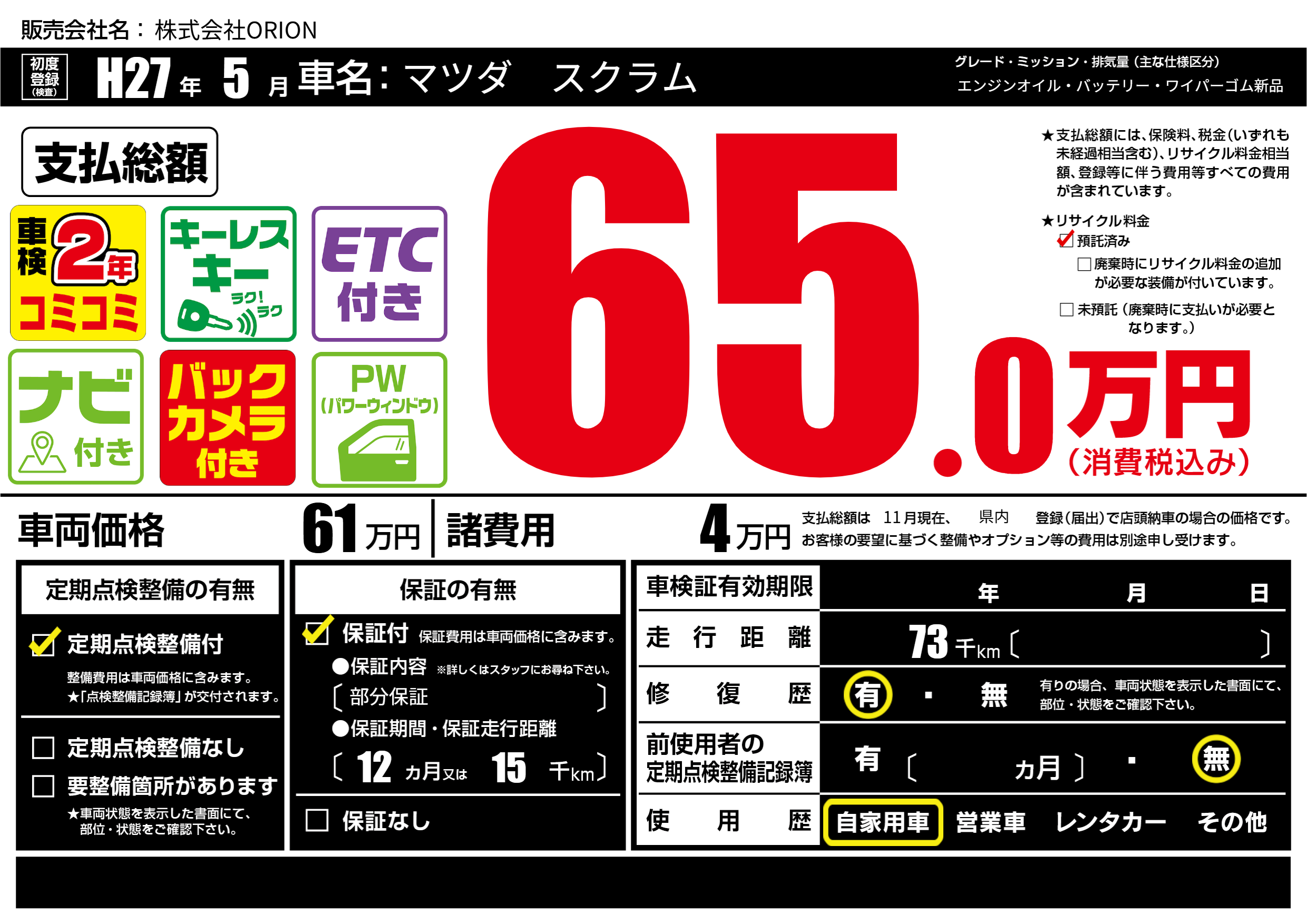 | 走行キロ | 7.3万km | 初年度登録 | H27年5月 |