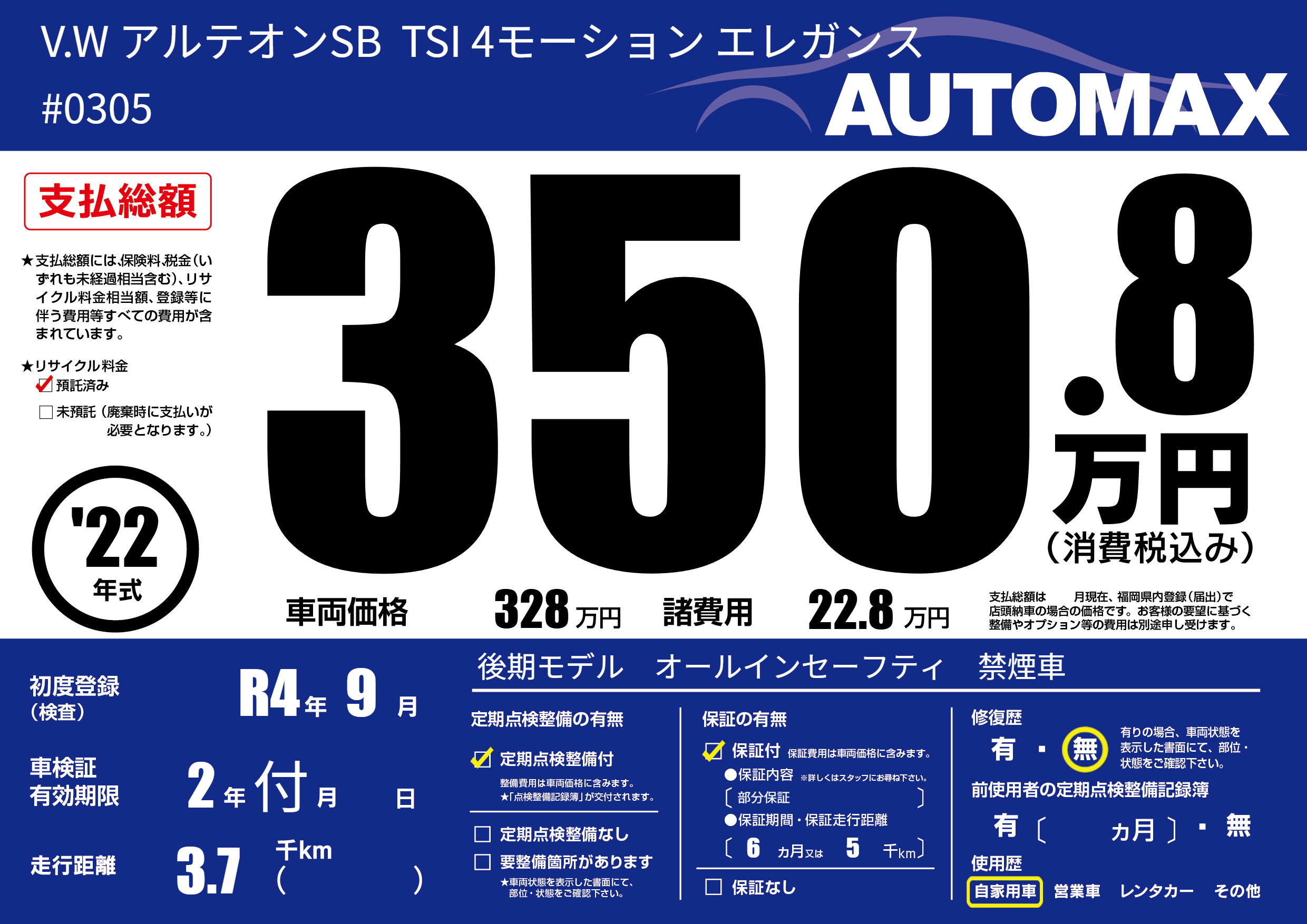 | 車名 | V.W アルテオンSB TSI 4モーション エレガンス | グレード ミッション 排気量 |